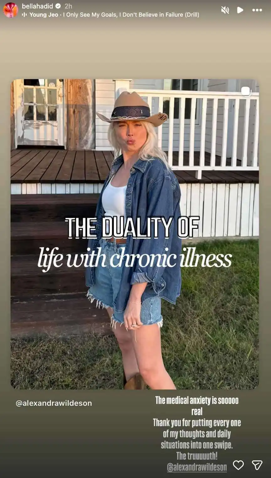 وأعادت حديد نشر منشورات تعبّر عن صعوبة التعايش مع المرض، بينها منشور للمؤثرة ألكسندرا وايلدسون بعنوان: “ازدواجية الحياة مع المرض المزمن”. وعلّقت بيلا مؤكدة أنها تشعر يوميًا بـ"القلق الطبي"، معتبرة أن المنشور يجسد أفكارها وتجاربها كاملةً.