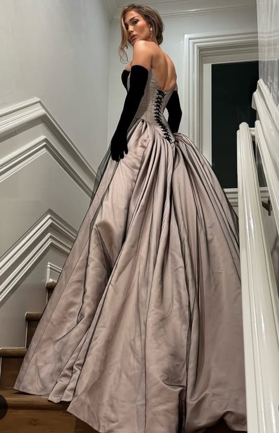 ظهرت بثوب دراماتيكي واسع، ينسدل بلونٍ بين الفضة والرمادي، كوميض معدني يلتقط الضوء من كل زاوية. جاء تصميمه مشدوداً من الخلف ككورسيه يحيط بالجسم بدقة، ليبرز تناسق القوام ويمنح الإطلالة حضوراً مهيباً.