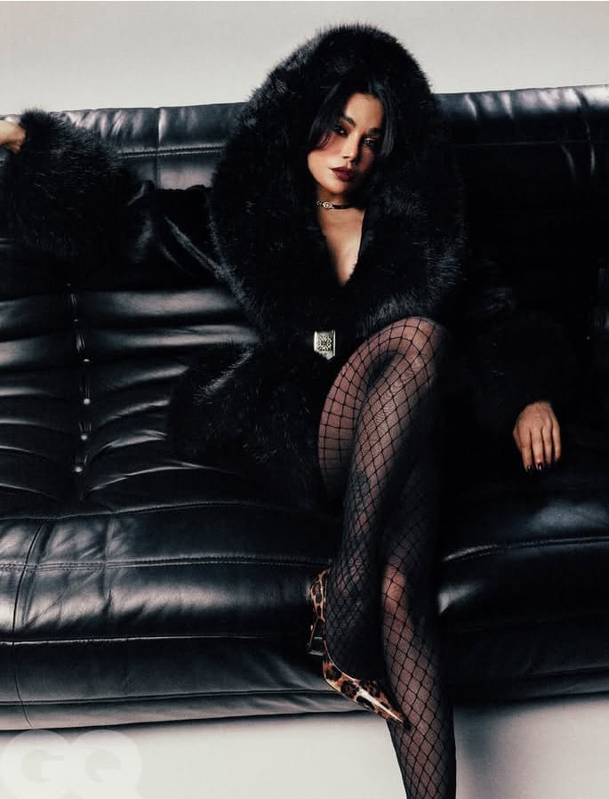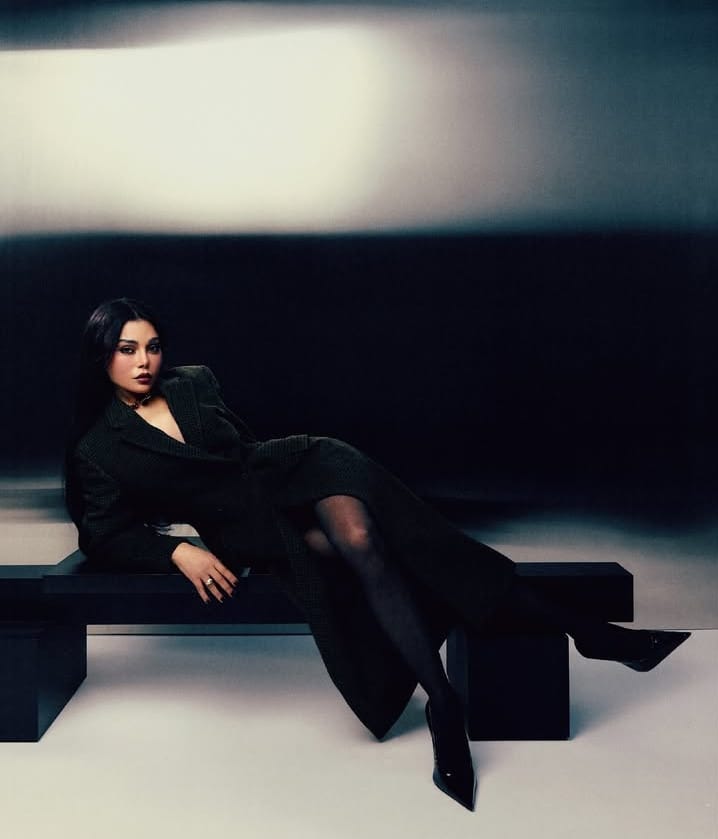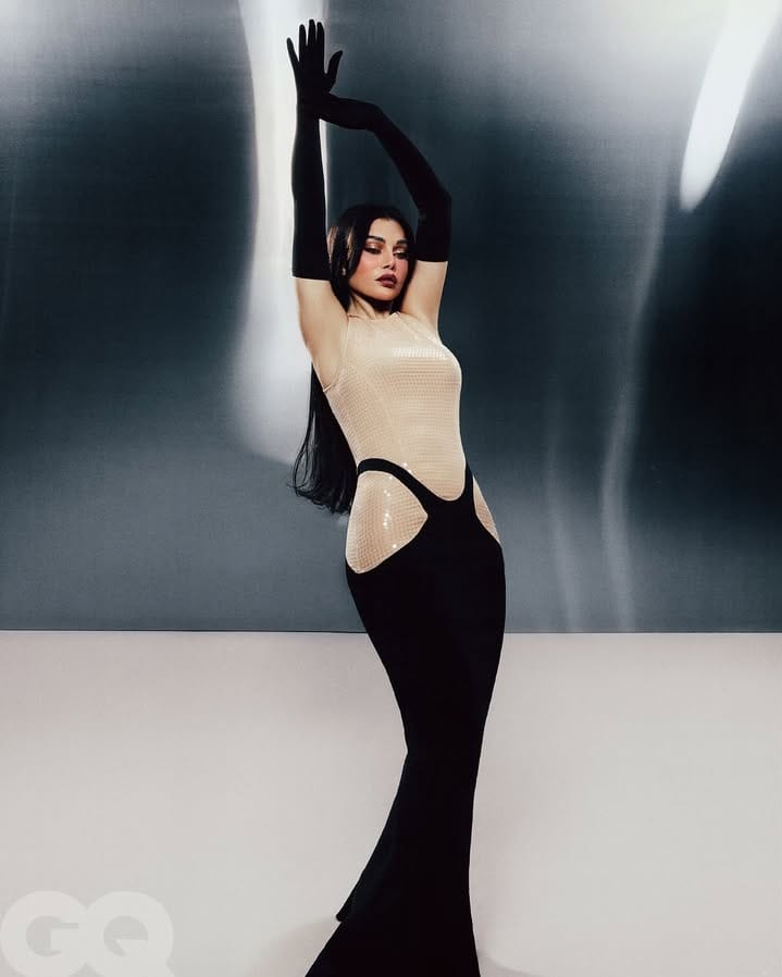 أكملته بقفازات سوداء طويلة من موغلر ولمسات Lily Blanc، لتظهر كساحرة تمشي فوق حافة الضوء والظل.