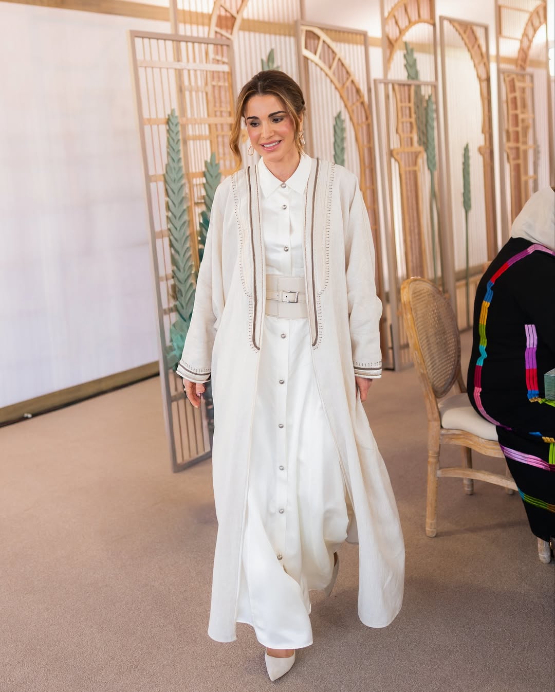 وكما هي العادة، حضرت الأناقة الهادئة التي تميّز أسلوب الملكة رانيا، فلفتتنا إطلالتها التي جمعت بين الفخامة الرصينة والبساطة المدروسة. فقد اختارت عباءة من الكتّان الفاخر باللون الأبيض العاجي، تنسدل بانسيابية فوق فستان مونوكرومي بتصميم القميص الكلاسيكي المزود بأزرار أمامية.