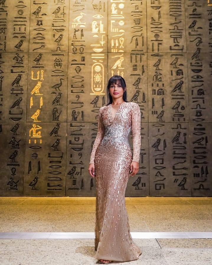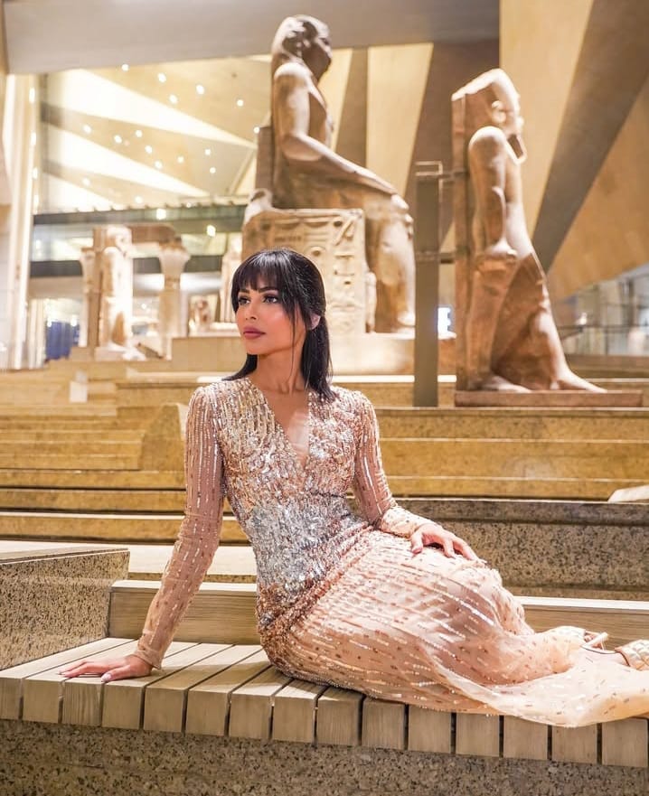 اختارت مهيرة فستاناً برّاقاً موشى بالتفاصيل اللامعة من توقيع المصمّم اللبناني العالمي طوني ورد، جاء بقَصّة انسيابية تلتقط الضوء كما تلتقط الروحُ دهشة المكان. ومع خلفية الحضارة المصرية العريقة، بدا الثوب كأنه جزء من المشهد، ينسجم مع الذهب الفرعوني والزخارف التي تروي حكايات آلاف السنين.