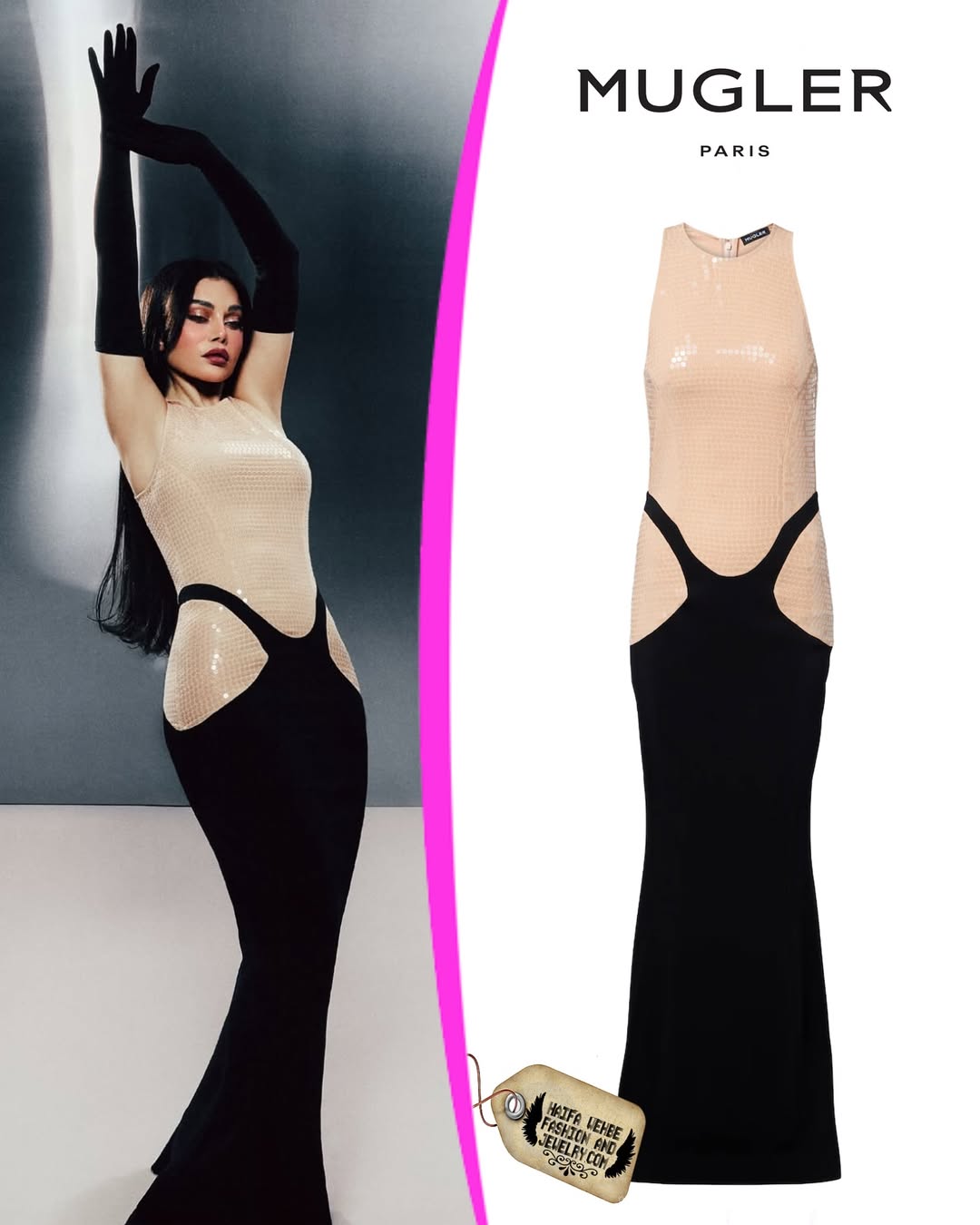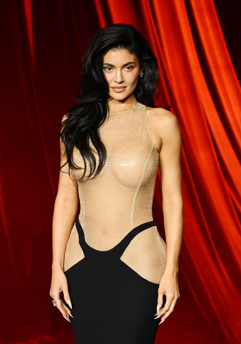 الفستان الشفاف من أرشيف دار Mugler (مجموعة ربيع 1998) جاء بلون قريب من لون البشرة، مع طبقة شفافة مرصعة بالترتر الطبيعي، وتنورة سوداء مزودة بفتحات كبيرة عند الورك أعطت شكل ذيل حوت معكوس. أكملت كايلي إطلالتها ببساطة المجوهرات، حلقين صغيرين وخواتم كبيرة، مكياج عيون بني مدخن، شفاه لامعة، وأظافر بلون بيج، ما جعل الفستان محور التركيز الكامل.