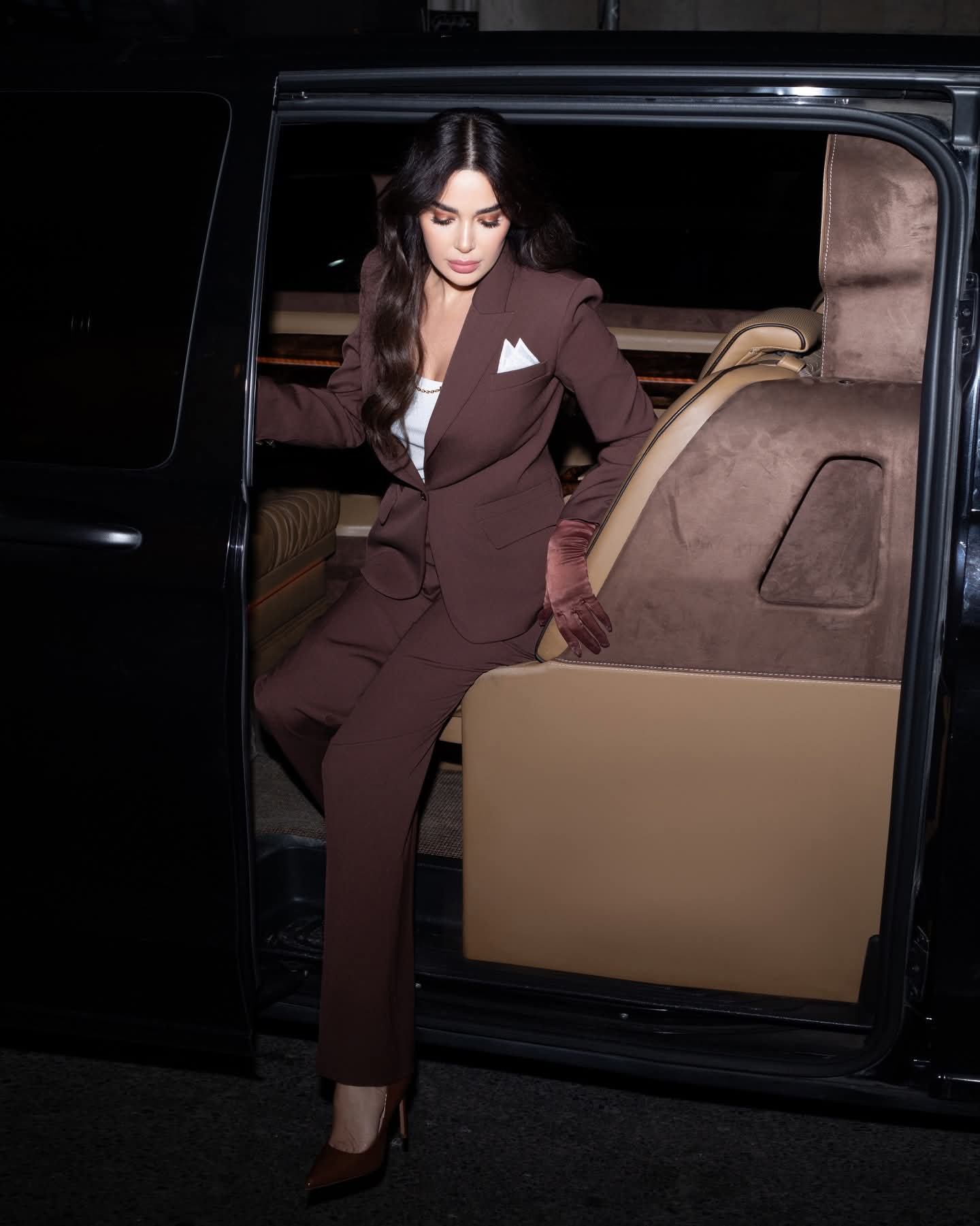 اختارت عبد النور بدلة بنية اللون ذات تصميم عصري يعكس أسلوبًا أنيقًا مناسبًا للمناسبات الخاصة. أضفت القفازات البنية لمسة من الفخامة، بينما أكمل الحذاء ذو الكعب العالي اللون نفسه لإطلالة متجانسة. كما نسّقت تيشيرتًا أبيض بسيطًا مع عقد ذهبي، مما أضفى توازنًا بين البساطة والفخامة.