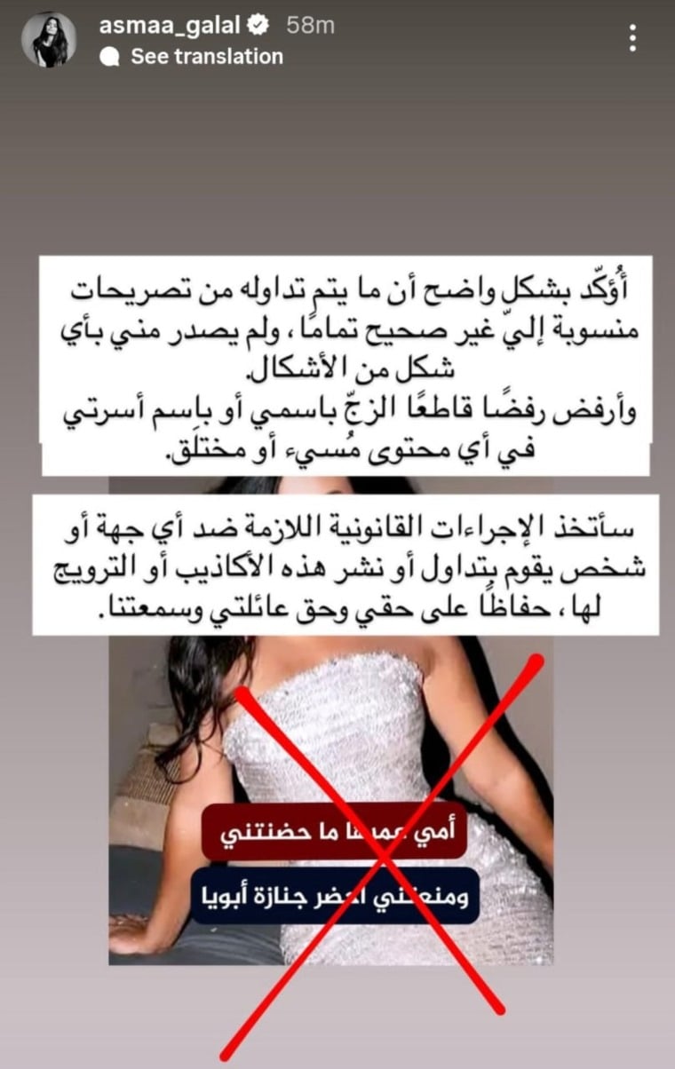 أوضحت أسماء جلال، عبر بيان نشرته على حسابها الرسمي في "إنستغرام"، أنها ترفض تماماً ما يُتداول حول علاقتها بأسرتها، مؤكدة أن الادعاءات بشأن منع والدتها لها من حضور جنازة والدها "عارية تماماً من الصحة" ولم تصدر عنها مطلقاً.