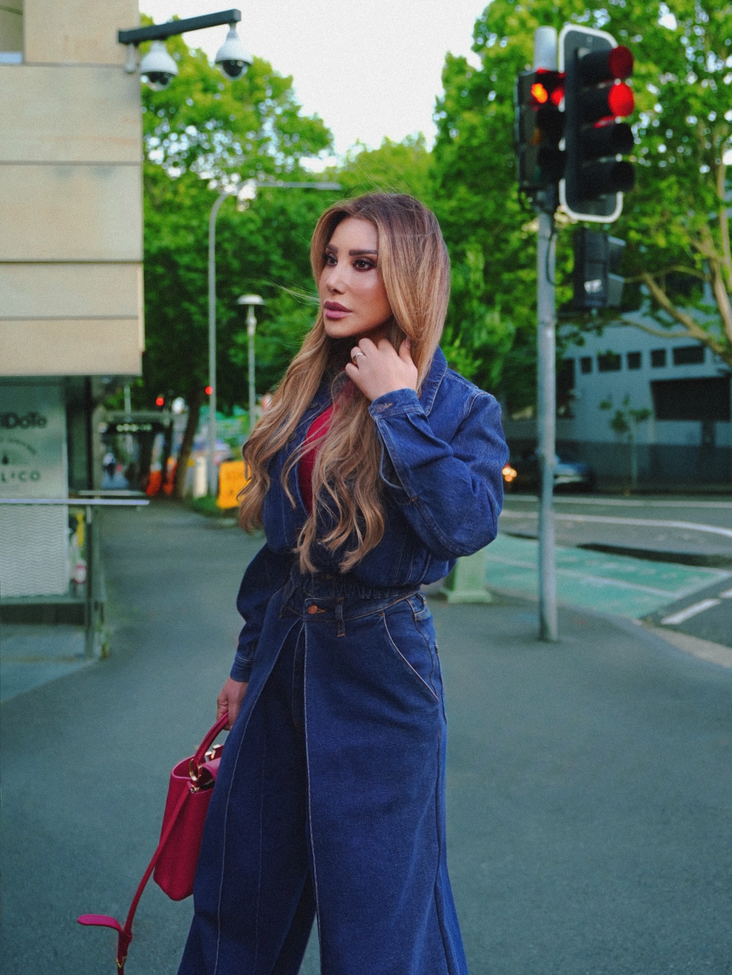 ارتدت جاكيت جينز فوق توب أحمر نابض، لون يشي بالحيوية ويعكس شخصيتها المتقدة دائمًا. البنطال الواسع عند الأقدام منحها خفة حركة وانسيابية، وكأنه مصمم لرفقتها في المدن البعيدة والسفر الطويل، فيما الجاكيت أضفى توازنًا عصريًا على الإطلالة، بين القوة والراحة في وقت واحد.