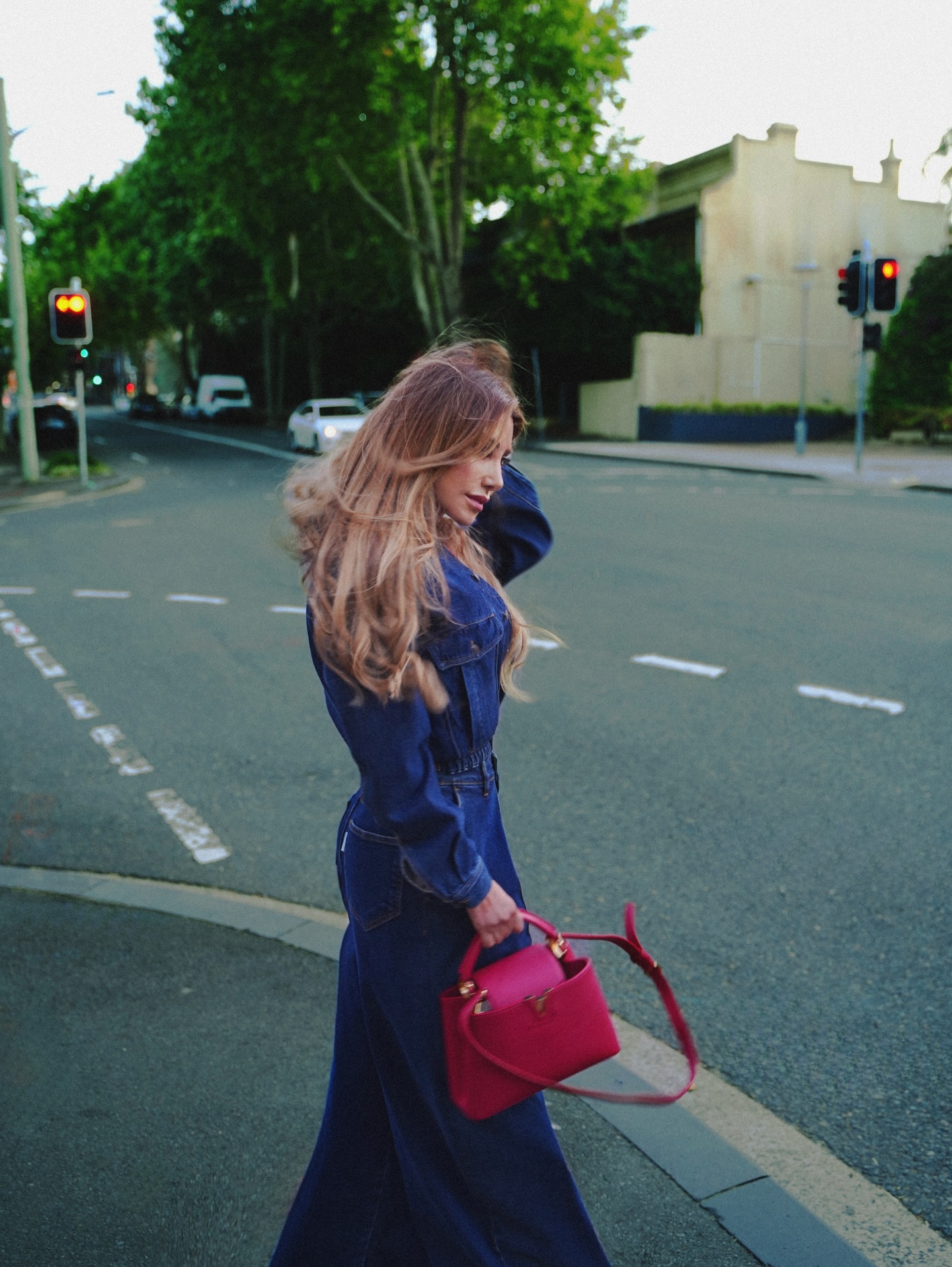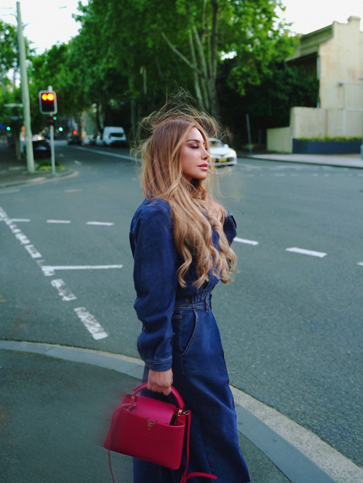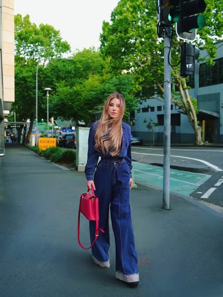 نسّقت الإطلالة مع حذاء رياضي (سبور) للمشي، اختيار عملي يليق بمدينة واسعة مثل سيدني، ويظهر جانبها الطبيعي غير المتكلّف. أما الحقيبة الفخمة بلون الفوشيا، فكانت النقطة اللامعة في المشهد—لمسة أنثوية جريئة تكسر هدوء الأزرق وتنسجم مع الأحمر الداخلي.