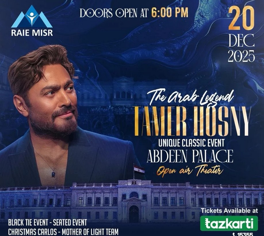 "الأسطورة العربية تامر حسني في حفل خيري في قصر عابدين يوم 20 كانون الأول، استمتعوا بأمسية كاملة العدد مع أشهر أغانيه وأجواء ساحرة في واحد من أهم معالم مصر."