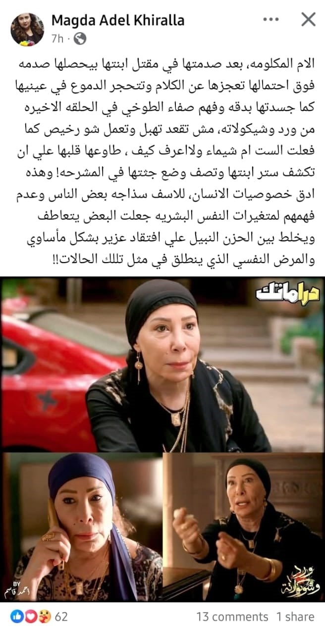 في سياق متصل، أثارت الناقدة الفنية ماجدة خيرالله جدلاً واسعاً بتوجيه انتقادات لاذعة لوالدة الإعلامية الراحلة شيماء جمال. جاء ذلك تعقيباً على ظهور الأم المتكرر عبر منصات التواصل الاجتماعي للتعليق على تفاصيل المأساة بالتزامن مع عرض أحداث المسلسل بطريقة وصفت بأنها لافتة.