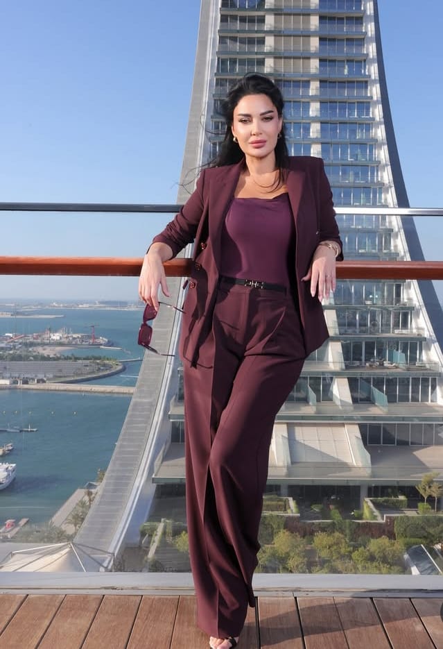 اختارت سيرين عبد النور صيغة أكثر حداثة للون البرغندي، عبر بدلة من Elisabetta Franchi مؤلفة من جاكيت أنيق وتوب حريري وبنطلون باللون نفسه.