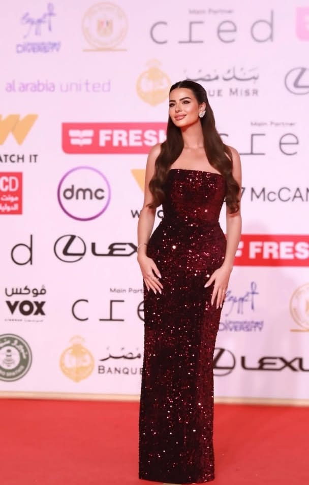اعتمدت هنادي مهنا ثوباً برغندياً بقصّة مستقيمة تنساب على الجسد كالقلم، بلمعة هادئة تزيده فخامة فيث ختام مهرجان القاهرة للسينما.