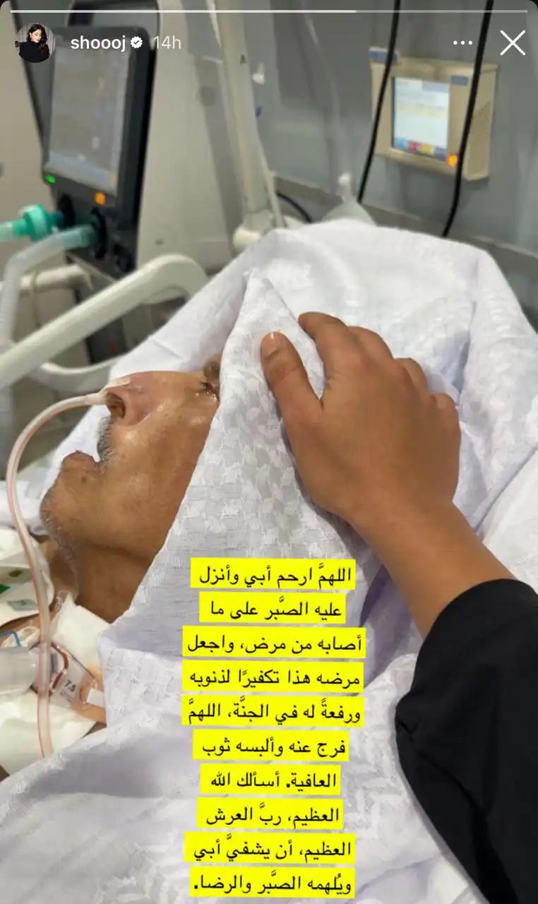 وعبر خاصية "ستوري" في حسابها على إنستغرام كتبت :"اللهم ارحم أبي وأنزل عليه الصبر على ما أصابه من مرض، واجعل مرضه هذا تكفيراً لذنوبه ورفعة له في الجنة. اللهم فرج عنه وألبسه ثوب العافية. أسأل الله العظيم رب العرش العظيم أن يشفي أبي ويلهمه الصبر والرضا."