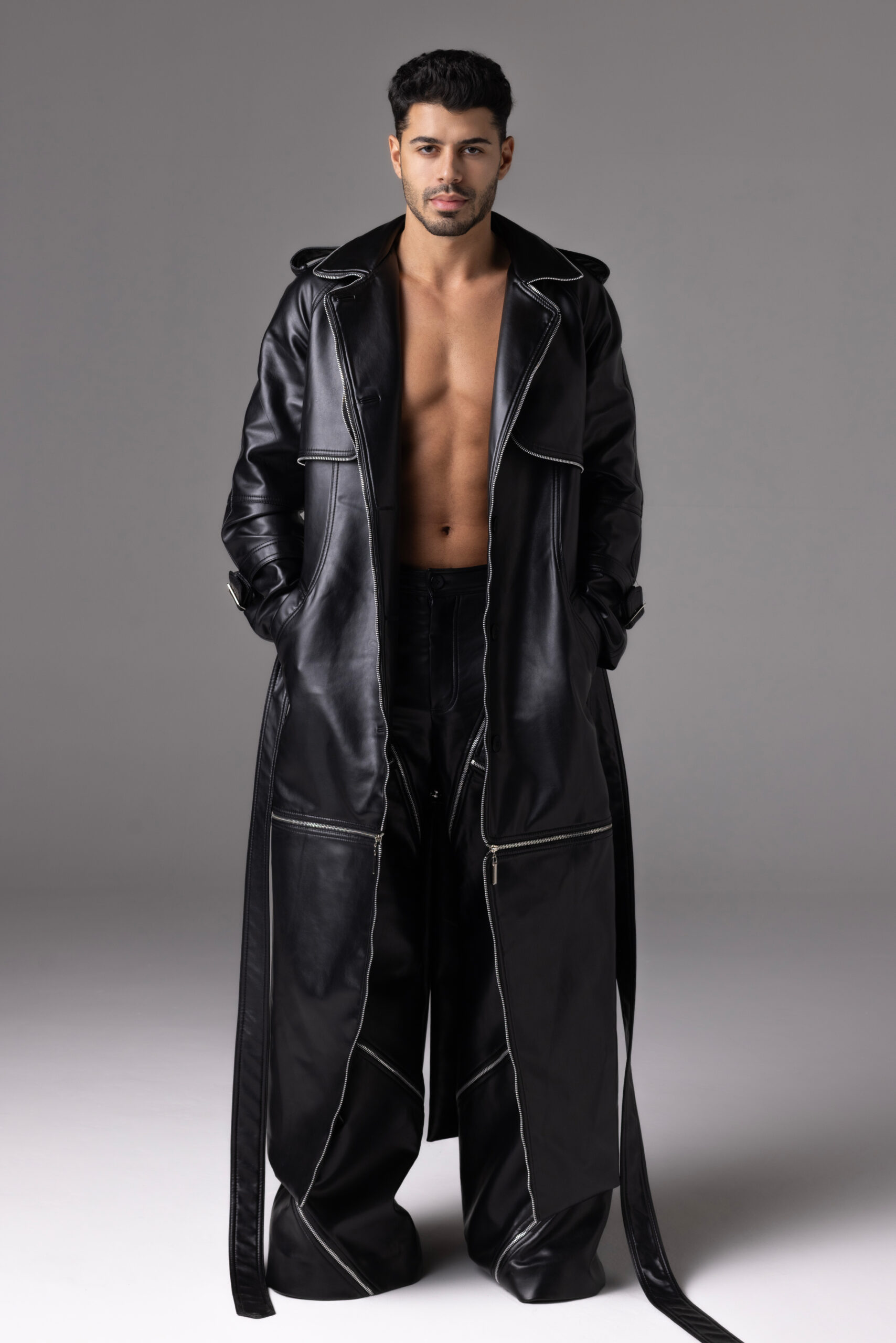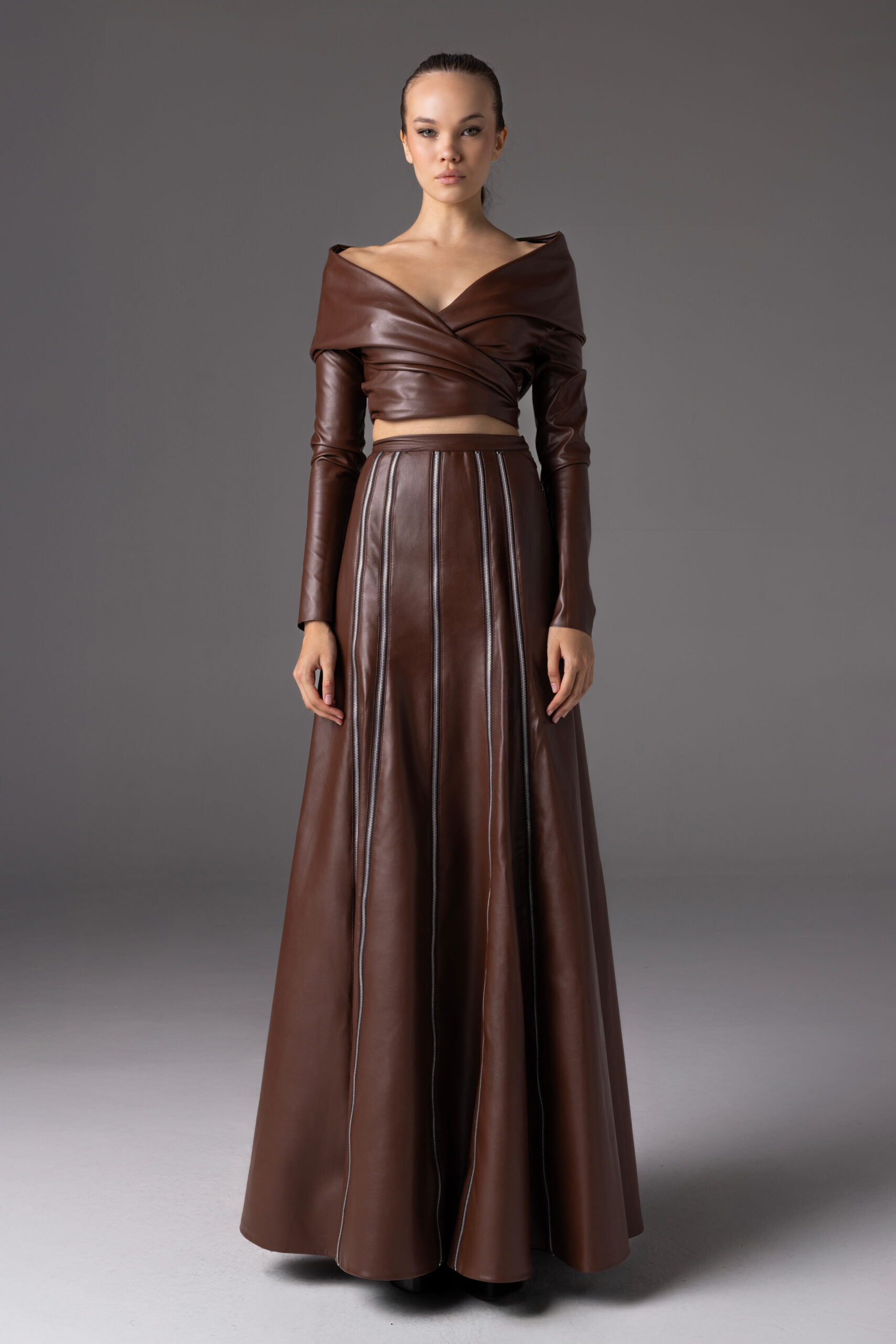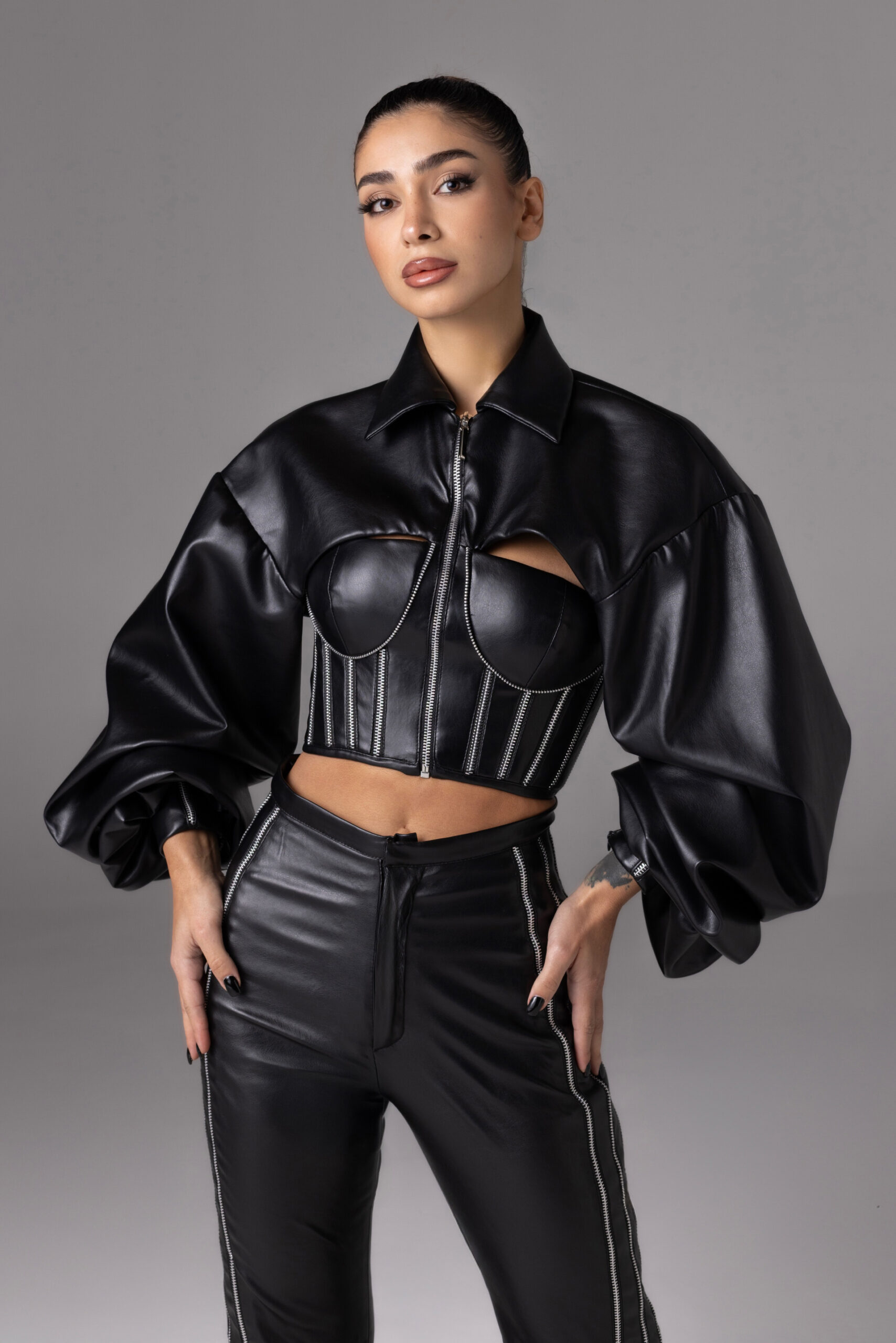 اختارت تيا الجلد كركيزة أساسية في التصاميم، مادة تمنح المرأة حضوراً طاغياً، وقوة ملموسة، لكنها أضافت إليها الدانتيل الذي يهمس بالرقة والشفافية، لتخلق هذا الحوار المتناغم بين التناقضات. إلى جانب الجلد والدانتيل، حضرت خامات أخرى مثل الصوف، الكريب، والبوبلين، صيغت بقصّات تجمع بين حداثة الشكل وفخامة التنفيذ.