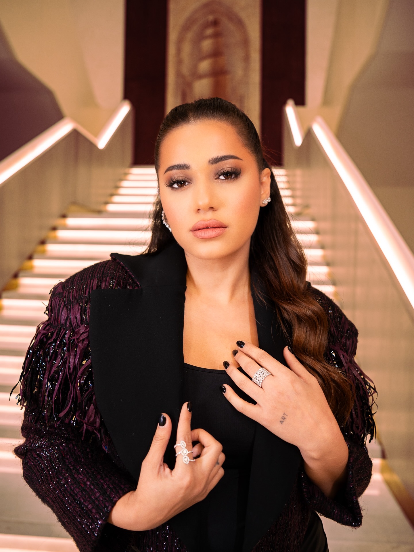 ومع الشعر المسرّح إلى الخلف بانسيابٍ خفيف على الظهر، ظهرت صفحة الوجه كاملة، مغمورة بضوءٍ ناعم أبرز ملامح رحمة بوضوح، فيما اختارت مجوهرات من زغيب لتختم المشهد ببريق خفيف يشبه المطر حين يلامس الليل.