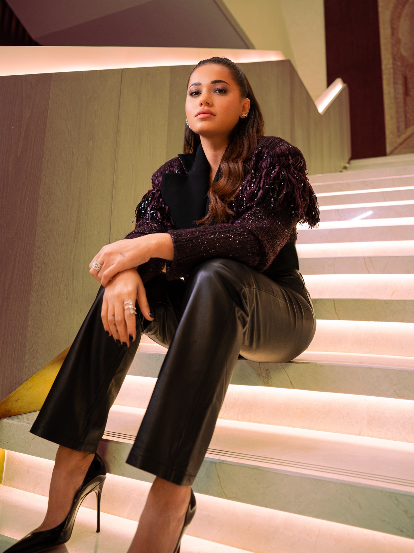 بلمسة تجمع بين الجرأة والرهافة، أطلت رحمة رياض بالأسود الكامل في إطلالة حملت توقيع Bazaza، واختارت أن ترافق جمهورها بهذه الصورة على إيقاع أغنيتها الجديدة "مطر". جاء البنطلون الجلدي الأسود الضيّق متماسكًا على القوام بانسيابية لافتة، تكمّله سكربينة بكعبٍ عالٍ مروس تُضفي حدّة أنيقة على الخطوط، فيما ارتقت الجاكيت القصيرة المطرّزة بالبريق والشراريب بالإطلالة إلى مستوى من اللمعان المدروس.