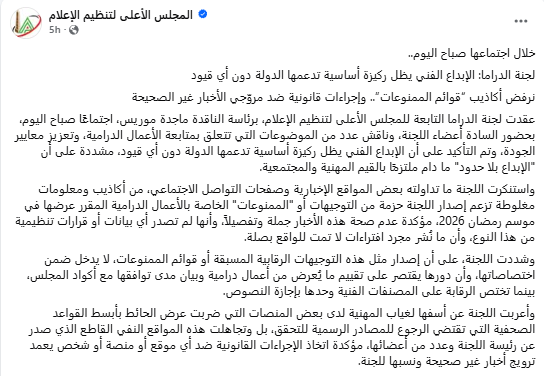 أصدرت لجنة الدراما التابعة للمجلس الأعلى لتنظيم الإعلام في مصر بيانًا رسميًا وحاسمًا ردت فيه على الجدل المثار مؤخرًا حول ما سُمي إعلاميًا بـ "قوائم الممنوعات" الخاصة بالأعمال الدرامية المعدة للعرض في موسم رمضان 2026. نفى البيان بشكل قاطع صدور أي توجيهات أو قرارات مسبقة تتعلق بمحتوى المسلسلات، مؤكدًا أن كافة المعلومات المتداولة على بعض المواقع الإخبارية وصفحات التواصل الاجتماعي هي معلومات مختلقة ولا أساس لها من الصحة.