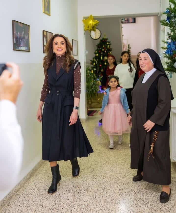 للمناسبة، اختارت الملكة رانيا إطلالة تُشبه مقصد الزيارة وروحها. ثوب أسود مزنّر بتناغم لافت، نسّقته مع قميص توب بني منقّط بالأبيض يمنح اللوك لمسة كلاسيكية دافئة، فيما انتعلت جزمة سوداء عملية وأنيقة، وتركت شعرها مفروداً بموجات عريضة تضيف نعومة إلى الإطلالة.