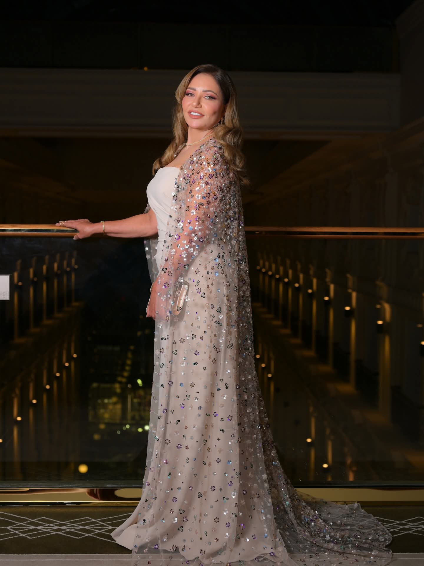 تقدّمت رزان جمال بثوب فضي من Georges Hobeika بدا كأنه منسوج من خيوط ضوء. شرائط تلتف بهدوء حول القوام، وياقة مفتوحة تمنح الإطلالة ملمساً من الرقي المطلق. كانت رزان تمشي كأن الفستان يتنفّس معها، يلمع، ثم يخفت، ثم يسطع من جديد.