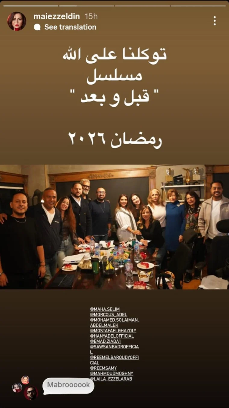ونشرت مي عز الدين عبر حسابها على إنستغرام صورة من كواليس التصوير، وعلّقت عليها: "توكلنا على الله.. مسلسل قبل وبعد رمضان 2026". وتظهر الصورة عددًا من الفنانين المشاركين في العمل، بينهم أسماء سبق أن تعاونت معهم في أعمال مهمة في مسيرتها الفنية.