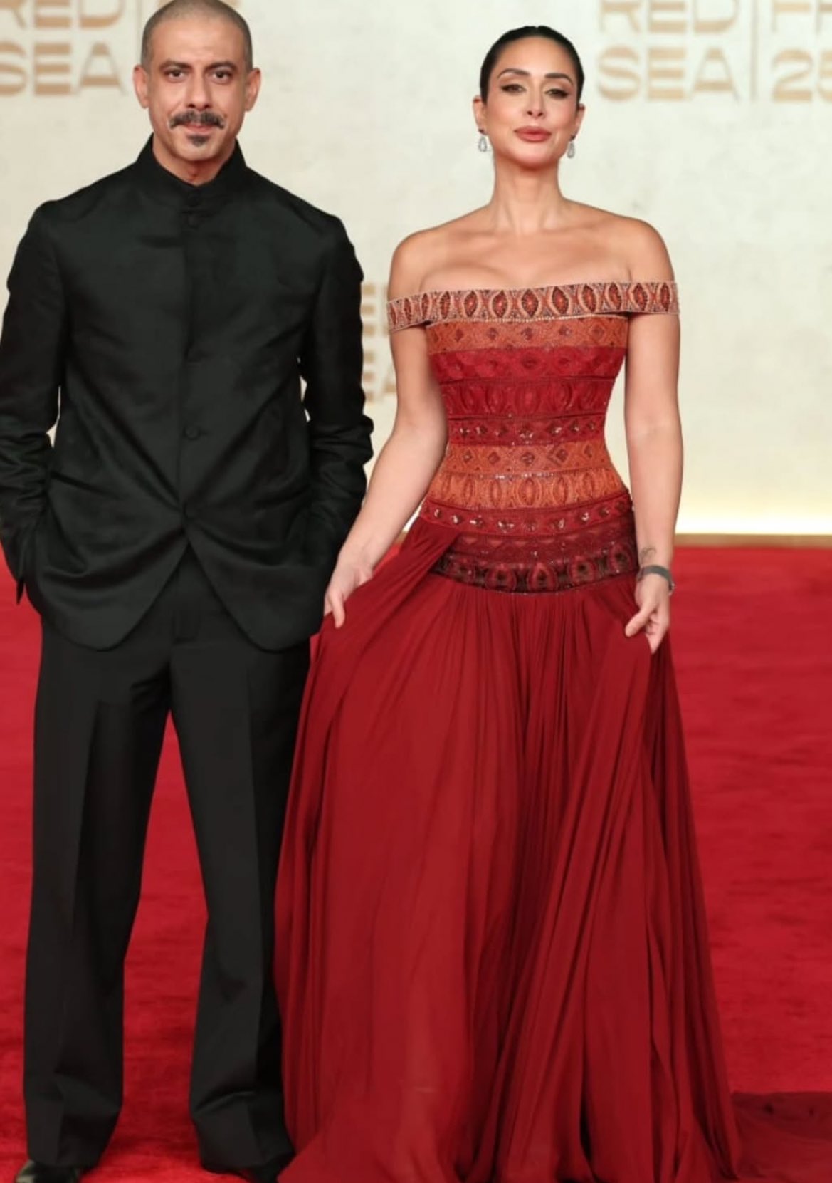 أطلت لمى عقيل بثوب طويل من Rami Kadi يكمش الجسم بانسيابية، مع ذيل طويل درامي. تداخل المخمل مع التول المورّد والأقمشة المنقوشة منح الفستان ثراءً بصرياً لافتاً.