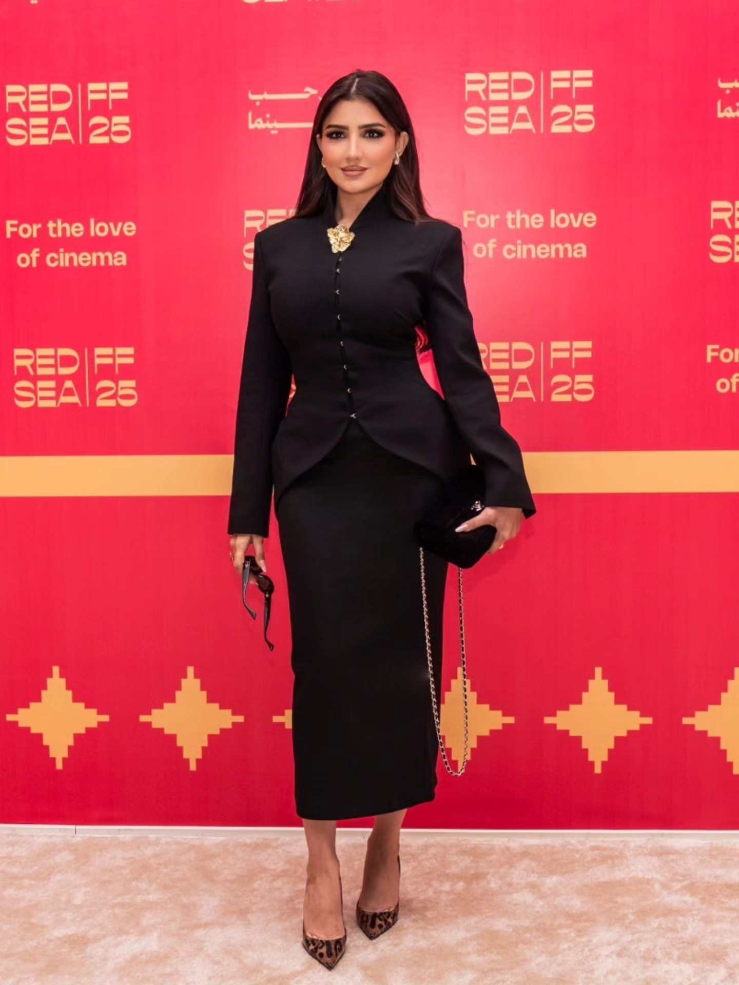 في أحد أيام المهرجان، اختارت مي عمر إطلالة تحمل الكثير من الرصانة والترف: تايور أسود من Lime بتنّورة بقصّة شانيل تنسدل حتى الكاحل، فيما ازدان ياقة الجاكيت روشيه ذهبي منحها وهجاً إضافياً.