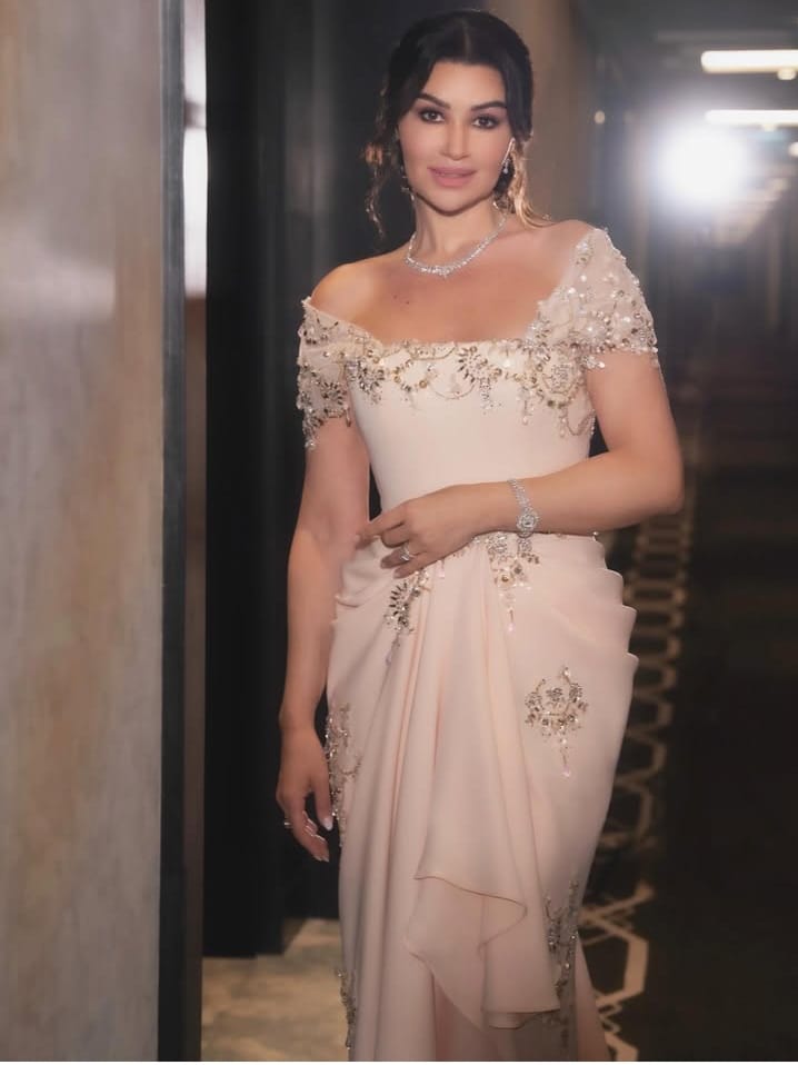 في لحظات امتزج فيها الضوء بالحميمية، ظهرت أروى بثوب نحاسي رقيق مرصّع بخيوط كريستالية دقيقة وخطوط طولية تنحت القامة برشاقة.