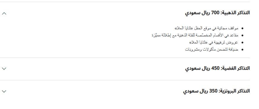 وحددت الجهة المنظمة أسعار التذاكر بثلاث فئات: 350 ريالاً سعودياً للفئة البرونزية، 450 ريالاً سعودياً للفئة الفضية، 700 ريال سعودي للفئة الذهبية.