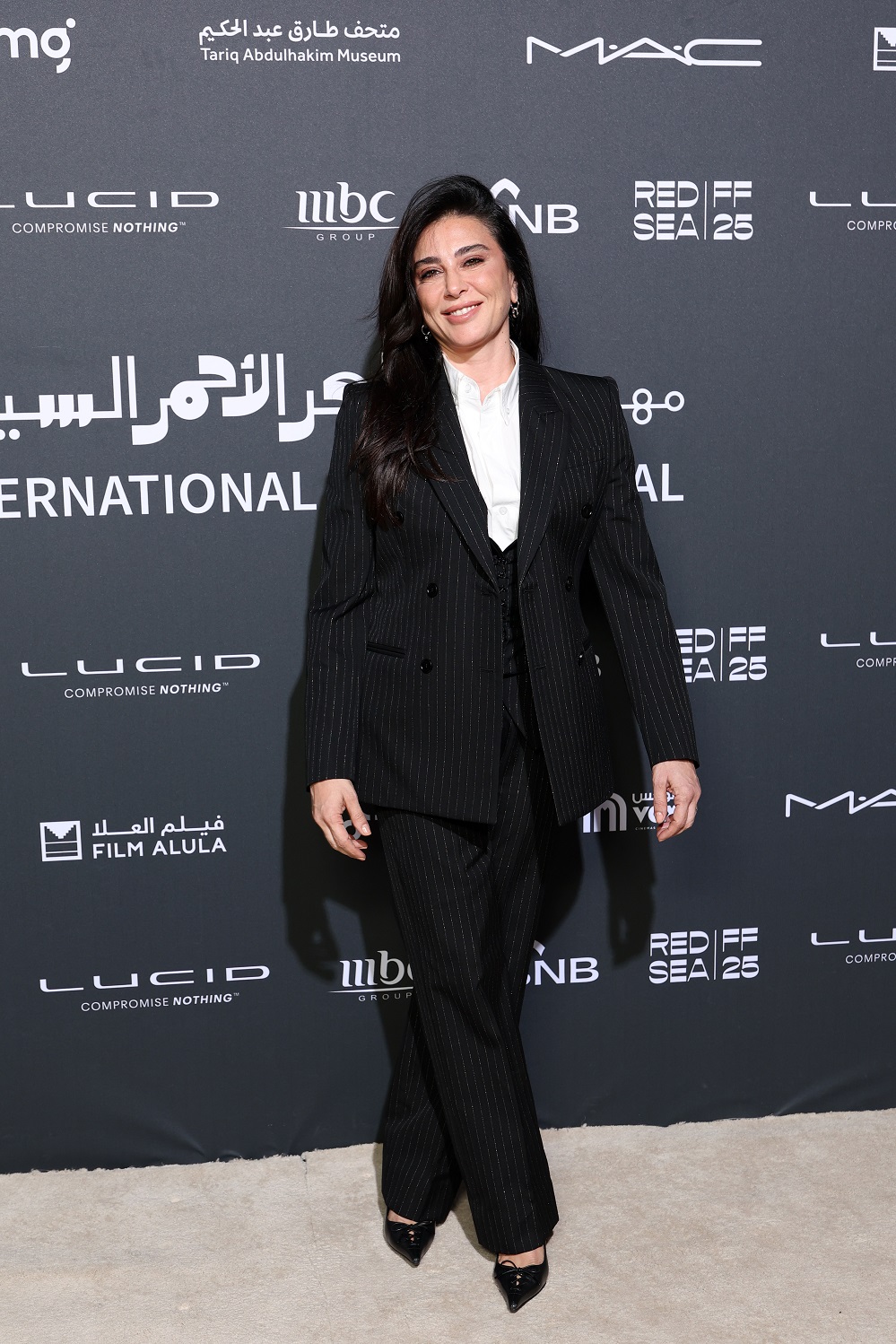 المخرجة اللبنانية نادين لبكي أبهرت الجميع بإطلالة بدلة رسمية سوداء من القماش المخطط، تتألف من بليزر طويل بقصة مستقيمة وأزرار أمامية تمنح حضورًا قويًا ومتوازنًا، مع بنطال واسع الساقين لإطلالة أنيقة وخالدة.