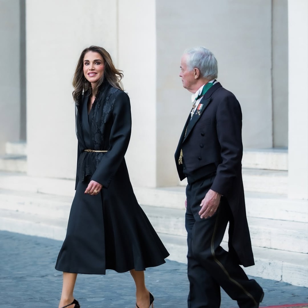 في زيارة تحمل رمزية خاصة، اختارت الملكة رانيا الأسود المطفأ بفستان ميدي كلاسيكي ينساب بخفّة، تضاعف أثره شال دانتيل بنقوش دقيقة كهمسة أنوثة لافتة.