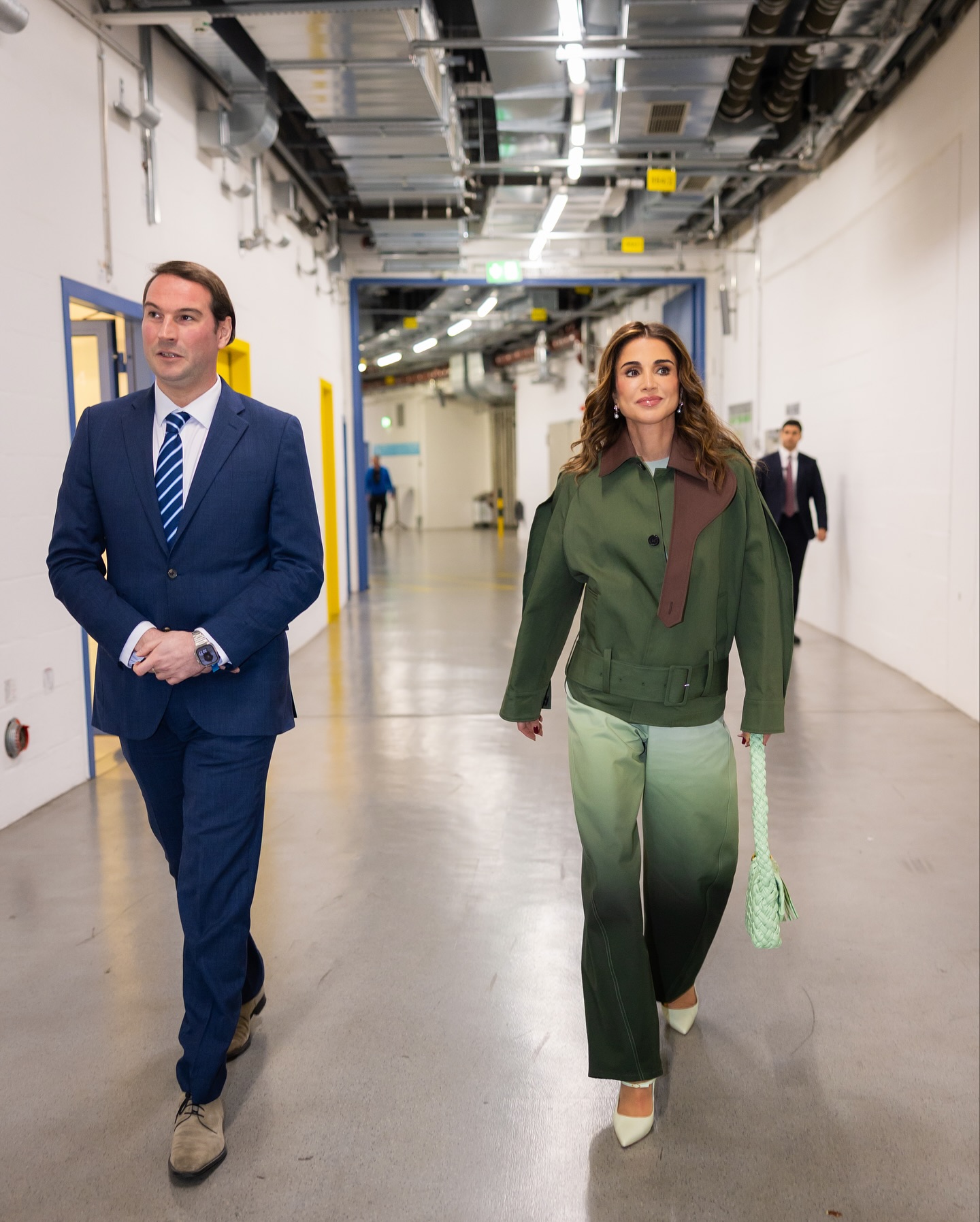 خلال قمة عالم شاب واحد، بدت الملكة رانيا بإطلالة عصرية بطابع عملي راقٍ. سروال Alaïa بتدرجات الأخضر المتحوّلة من النعناع إلى الزيتوني، وسترة من JW Anderson تنسجم معها بذكاء لوني.