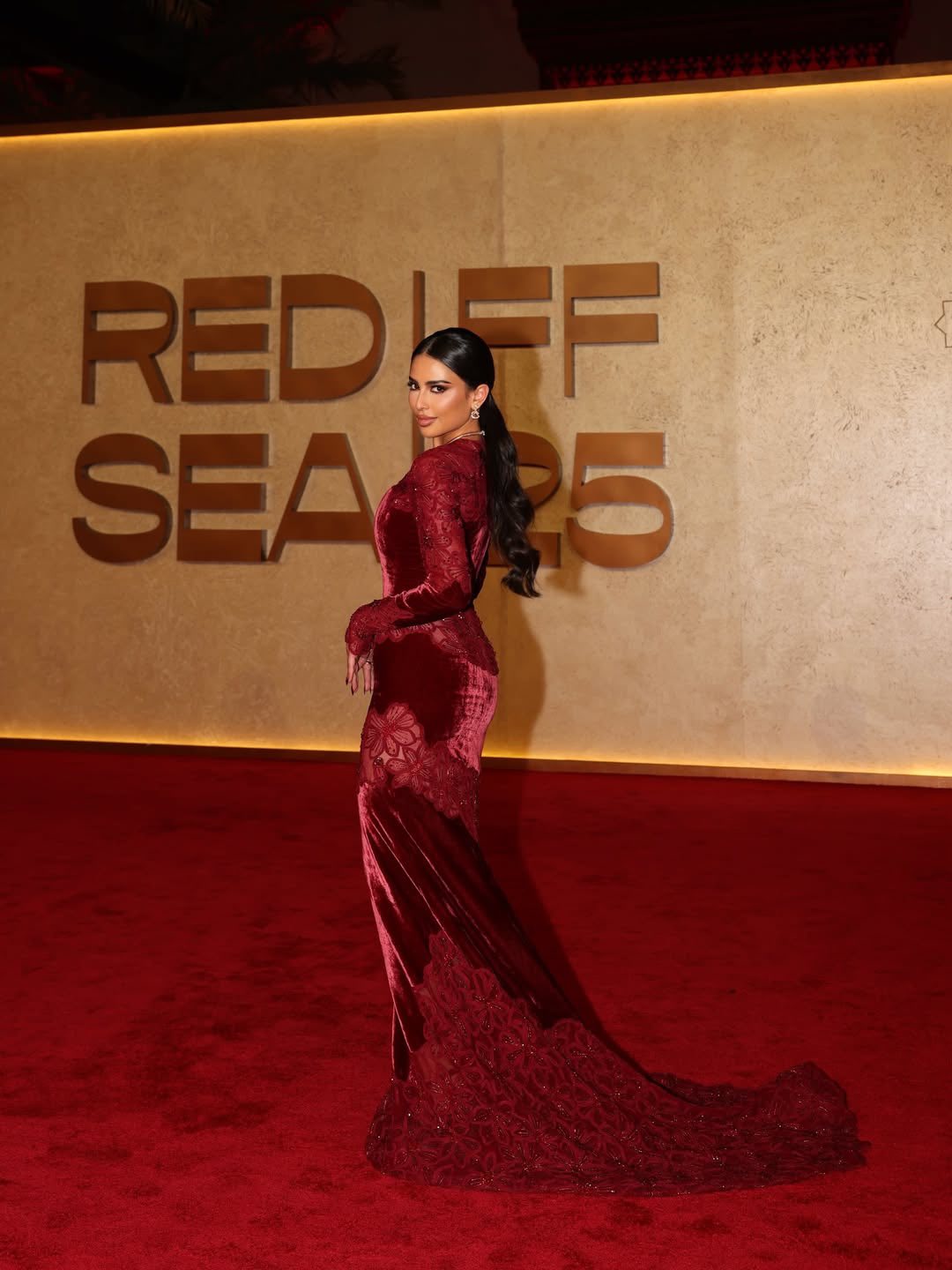 من مجموعة L’Éventail لخريف وشتاء 2025–2026، ارتدت لمى العقيل فستاناً من المخمل الأحمر الكرزي، يزهر بتفاصيل أوغانزا منحوتة وتطريزات دقيقة.
