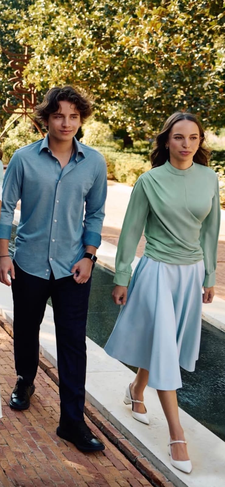 اعتمدت العائلة لوحة لونية متناغمة تميل إلى الأخضر بدرجاته المختلفة، مع لمسات من الأزرق الفاتح والبيج، في اختيار ذكي يعكس التجدد والسلام. الأزياء جاءت بسيطة وأنيقة، بقصّات ناعمة وخالية من المبالغة، ما عزز وحدة المشهد البصري وأبرز الانسجام العائلي دون طغيان فردي.