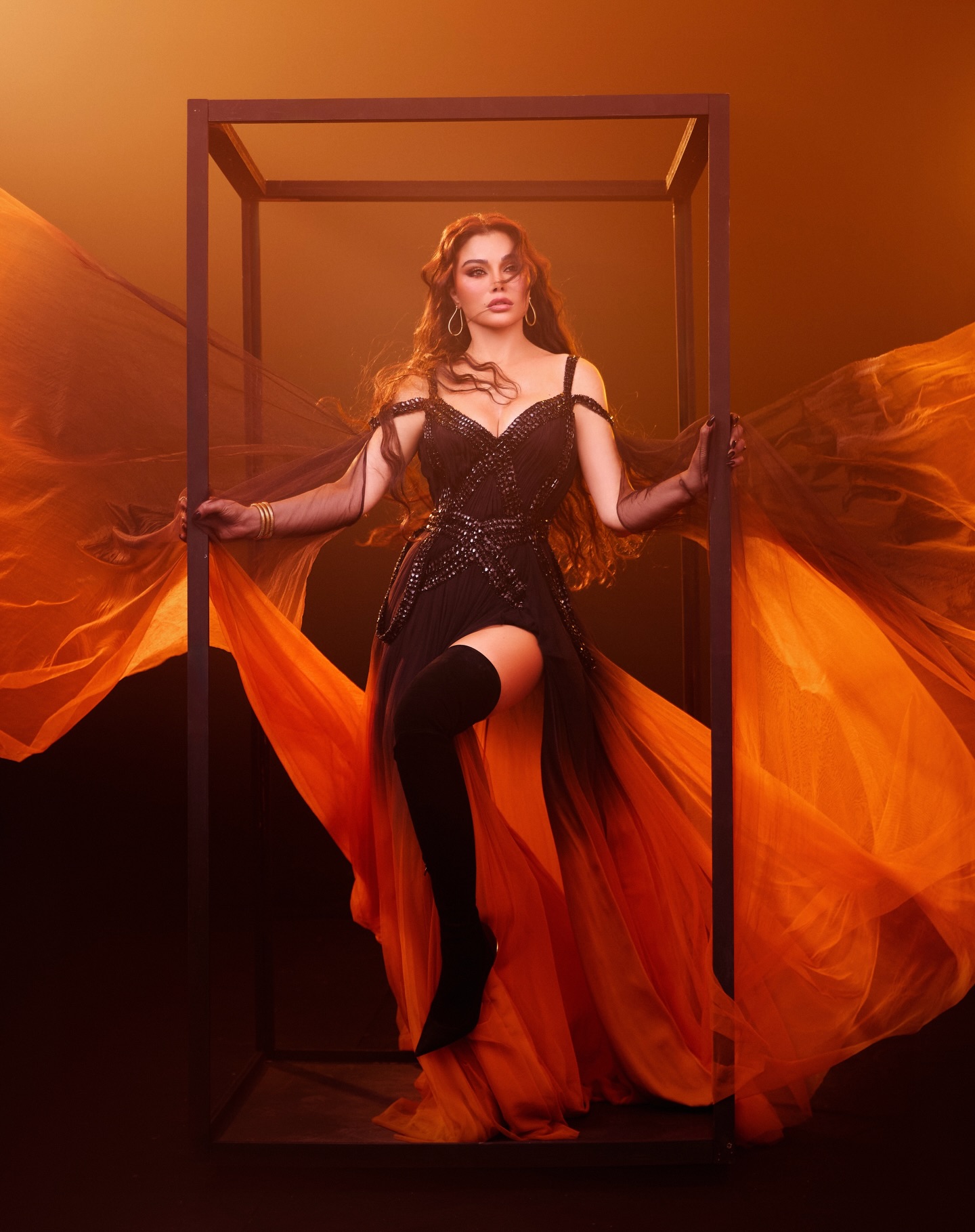 لا تتخلى هيفاء عن عدتها المعروفة بالظهور الانثوي قبل المواجهة، فترتدي الملابس الرقيقة الناعمة المتطايرة، والألوان النارية التي تشتعل على الجسد. أقمشة خفيفة تتحرّك مع الريح، تذكّر بأن القوة لا تناقض الهشاشة، بل تولد منها. الأحمر، البرتقالي، واللمعان الحاد، والجلد الأسود ليست عناصر جمالية فحسب، بل إشارات إلى امرأة تعرف كيف تشعل حضورها من دون أن تتخلّى عن أنوثتها.