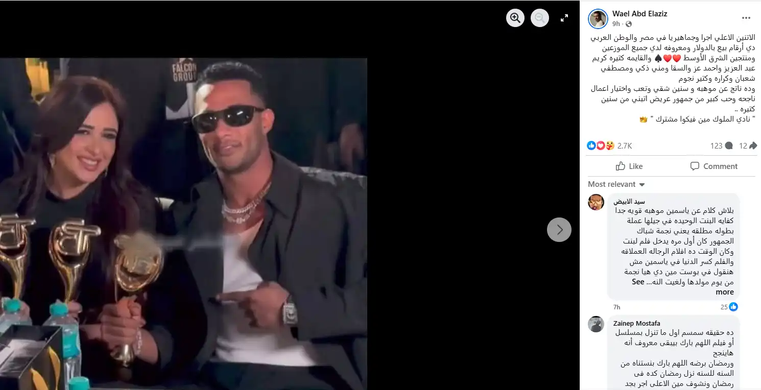 نشر وائل عبد العزيز صورة تجمعه بشقيقته ياسمين عبد العزيز والنجم محمد رمضان خلال تكريمهما في أحد المهرجانات، معلقًا بوضوح: "الاتنين الأعلى أجرًا وجماهيرية في مصر والوطن العربي، دي أرقام بيع بالدولار ومعروفة لدى جميع الموزعين ومنتجين الشرق الأوسط". ولم يقتصر شقيق ياسمين عبد العزيز على هذين الاسمين فقط، بل أضاف أن قائمة النجوم الأعلى أجرًا تضم أسماء كبيرة أخرى، قائلًا: "والقائمة كتيرة.. كريم عبدالعزيز، أحمد عز، السقا، منى زكي، مصطفى شعبان، كرارة، وكتير نجوم". وأوضح عبد العزيز أن تصدر هؤلاء النجوم المشهد جاء نتيجة لمسيرة فنية طويلة من الموهبة والعمل الجاد والاختيارات الناجحة، مؤكدًا أن حب الجمهور العريض "اتبنى من سنين كتيرة".