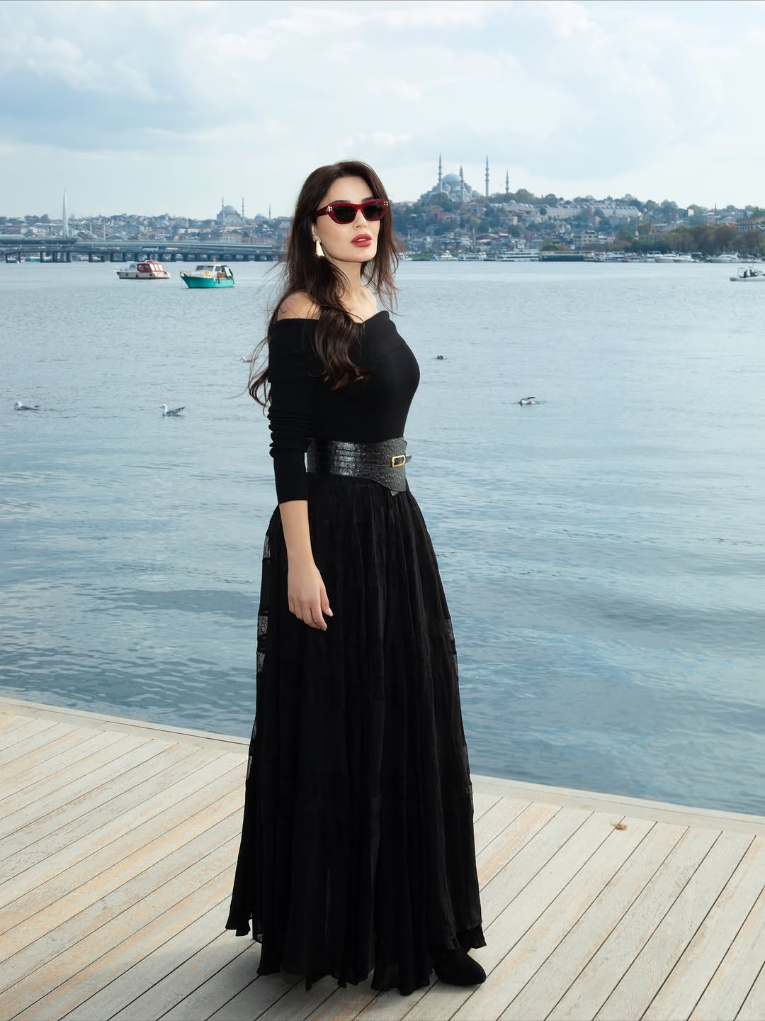 اختارت سيرين عبد النور تنورة سوداء طويلة من Marella بنمط غجري أنيق، مزيّنة بخطوط دانتيل شفافة تضيف خفّة وأنوثة. نسّقتها مع كنزة ناعمة بأكتاف مكشوفة، وحزام جلدي عريض أبرز خصرها.