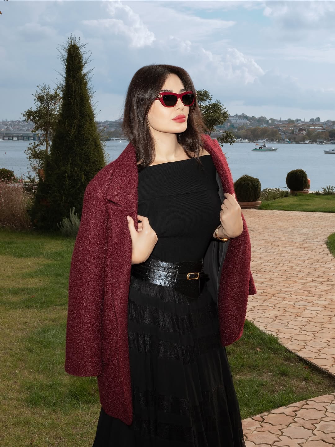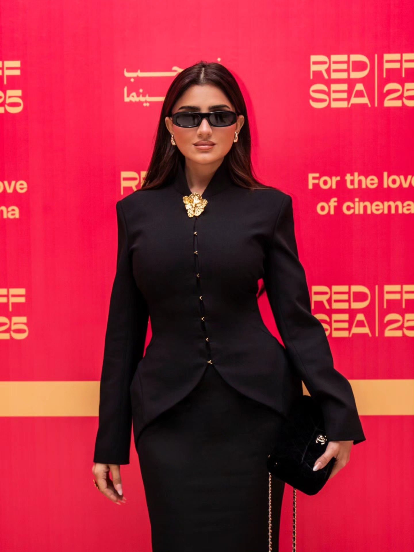 جاكيت برغدي غامق أضاف عمقاً لونياً دافئاً، فيما جاءت النظارات الحمراء والأقراط الذهبية الهندسية لتمنح اللوك جرأة عصرية محسوبة.