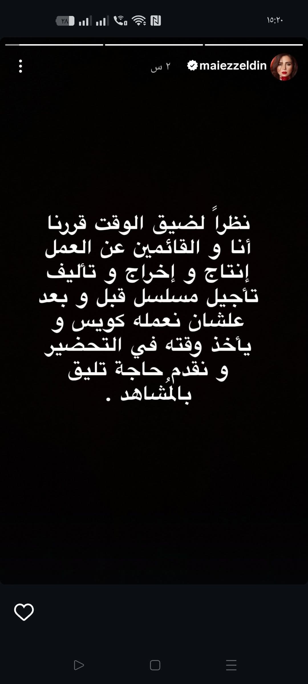 «نظرًا لضيق الوقت قررنا أنا والقائمين على العمل إنتاج وإخراج وتأليف تأجيل مسلسل قبل وبعد، علشان نعمله كويس ويأخذ وقته في التحضير ونقدم حاجة تليق بالمشاهد».