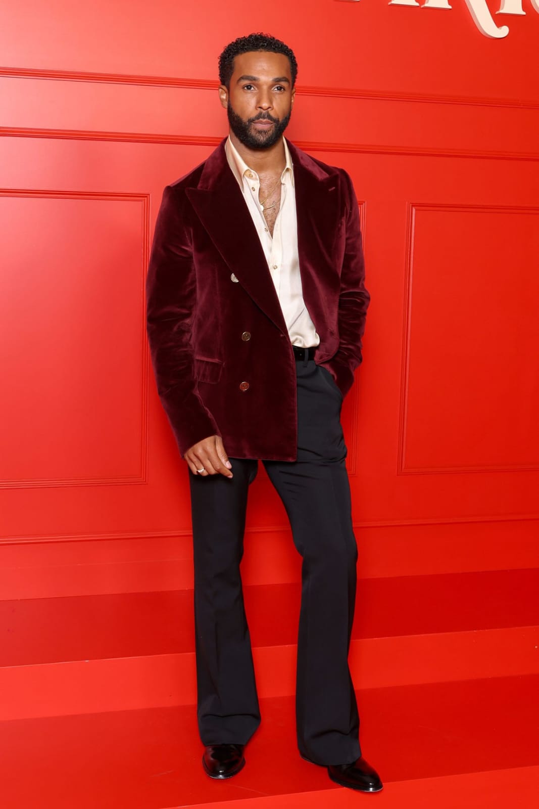 تألّق لوسيان لافيسكونت ببدلة من Dolce & Gabbana، مؤلّفة من سروال أسود، قميص حريري أبيض، وسترة مخملية بلون برغندي غني، مع حذاء من الجلد الأسود اللمّاع.