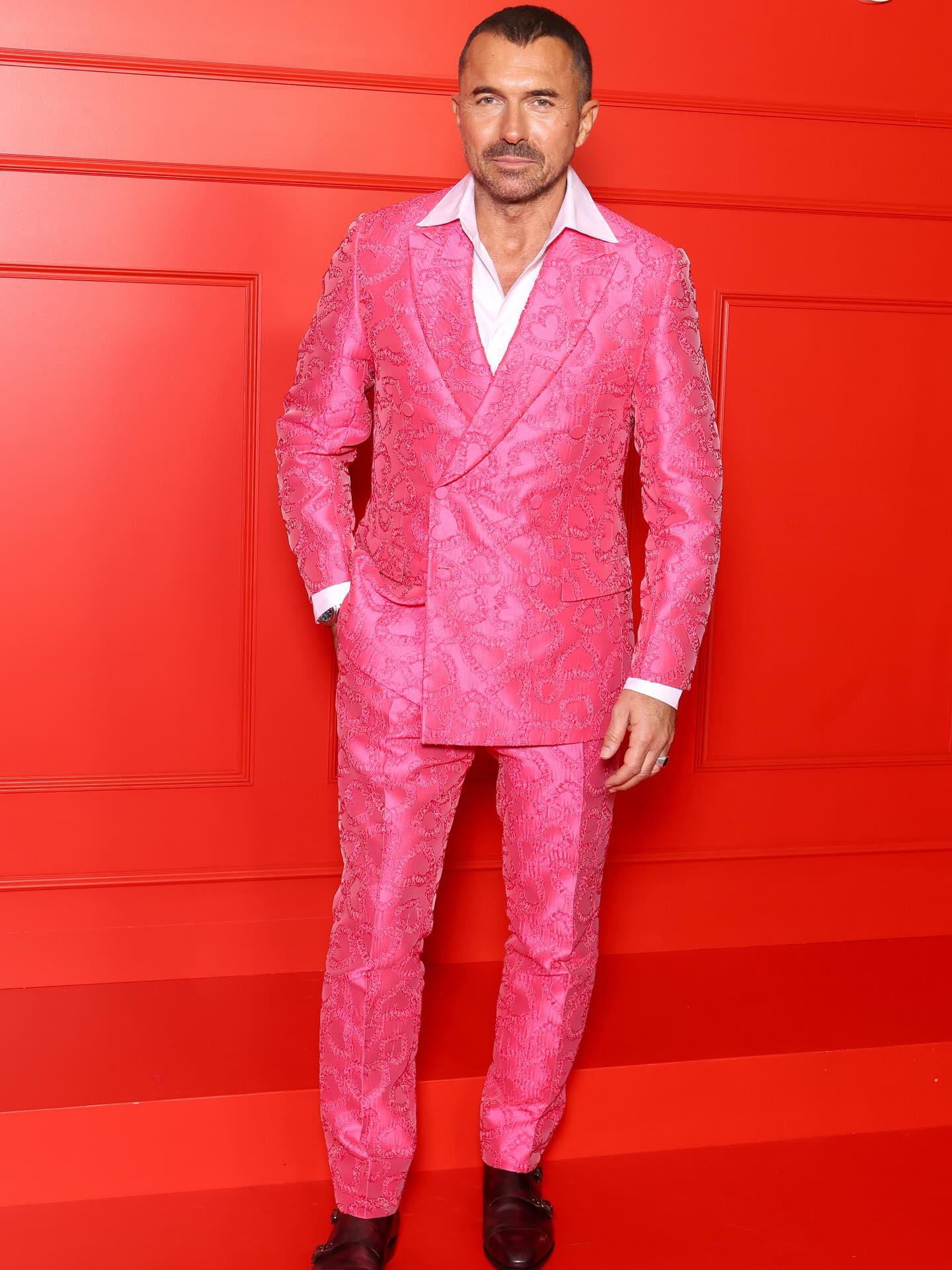 أما ويليام آبادي، فلفت الأنظار ببدلة وردية مزخرفة، نسّقها مع قميص أبيض وحذاء جلدي بلون بني-برغندي بتفصيل إبزيمين، مؤكّدًا أن الجرأة حين تُحسن تنسيقها، تتحوّل إلى توقيع شخصي.