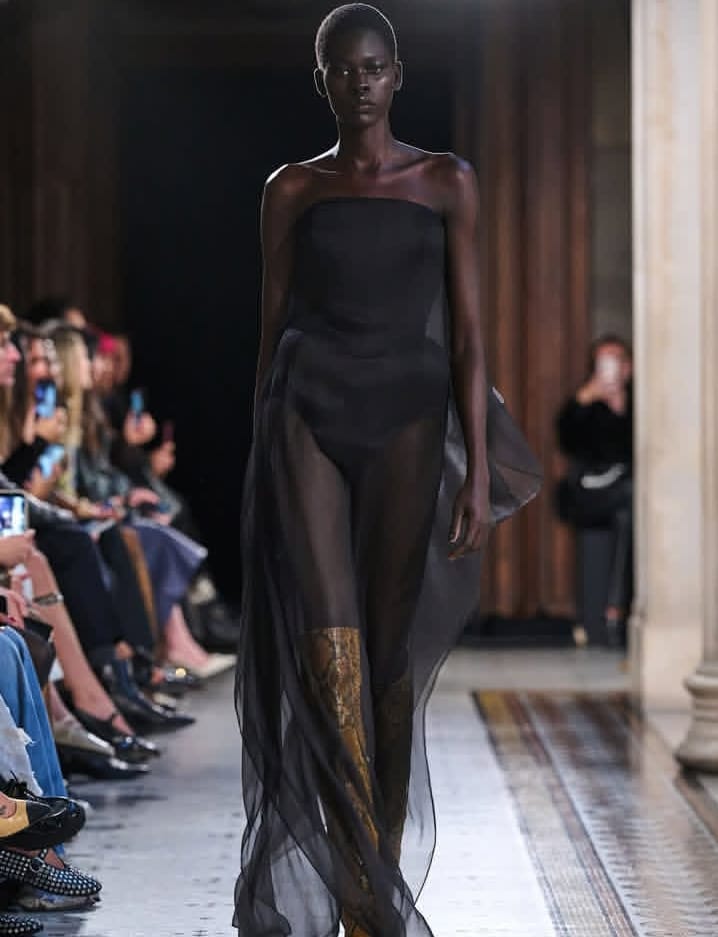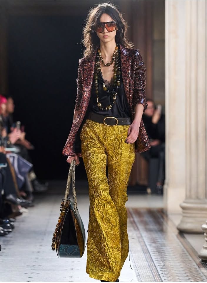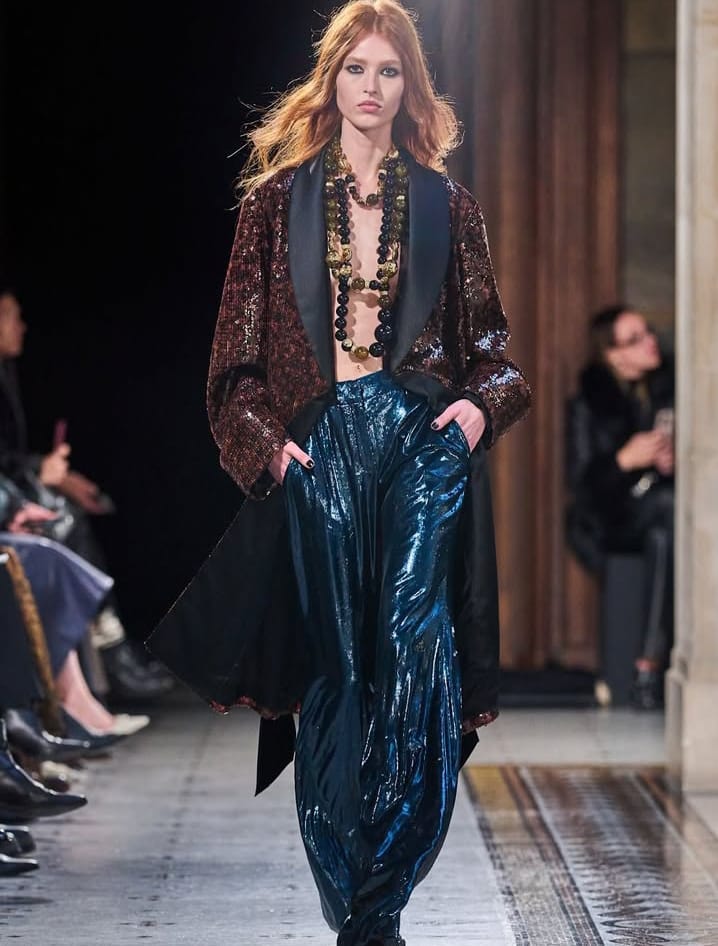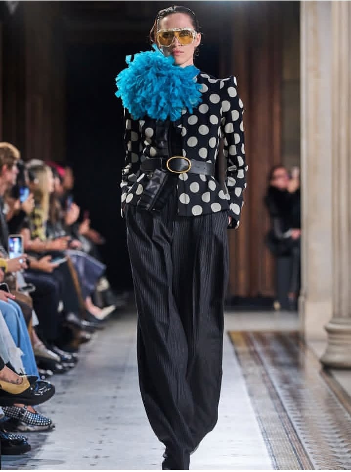 - ألواح شفافة في مواجهة خياطة حادة، سراويل بروكار ذهبية إلى جانب دانتيل رقيق، سترات مرصعة بالترتر فوق فساتين انسيابية.