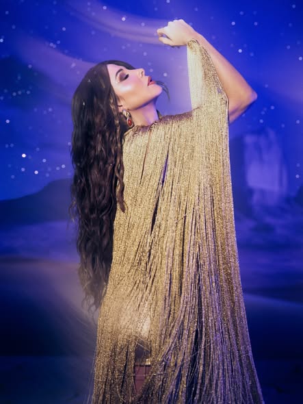 ثوب فريد من نوعه، يجمع بين الجرأة والفخامة، مصنوع من بودي تغطيه خيوط ذهبية دقيقة وكأنها موجات من الضوء تتحرك برفق مع كل خطوة، لتكلل أكتافها كوشاح أميرة، وتنثر بريقاً حولها كما لو أن الذهب نفسه يعانقها.