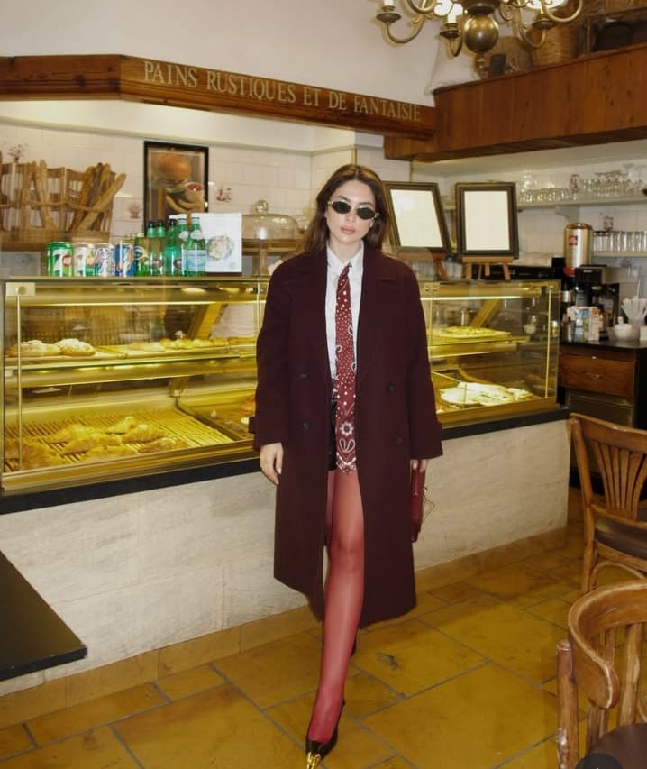 اختارت لين برنجكجي بدلة سوداء قصيرة مع قميص أبيض وربطة عنق بوردو ومعطف بنفس اللون، مانحةً الإطلالة لمسة ذكورية مع لمسة أنثوية راقية، تؤكد أن البدلة يمكن أن تكون جريئة ومليئة بالشخصية.