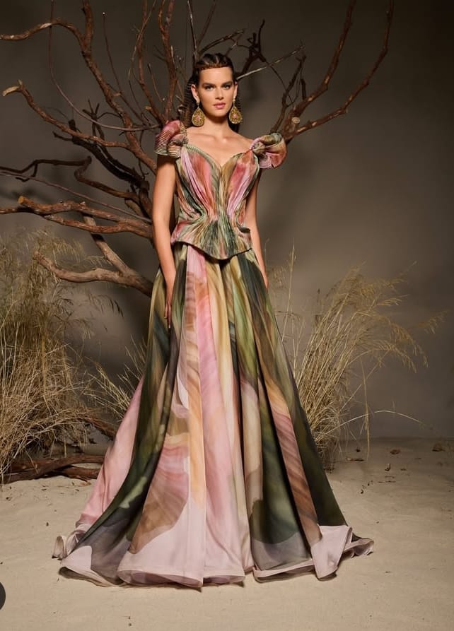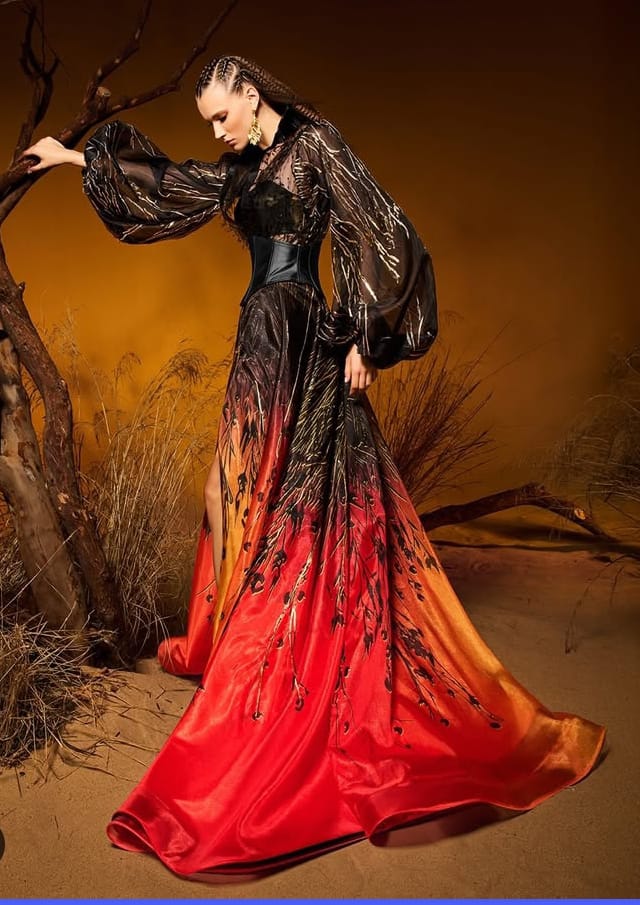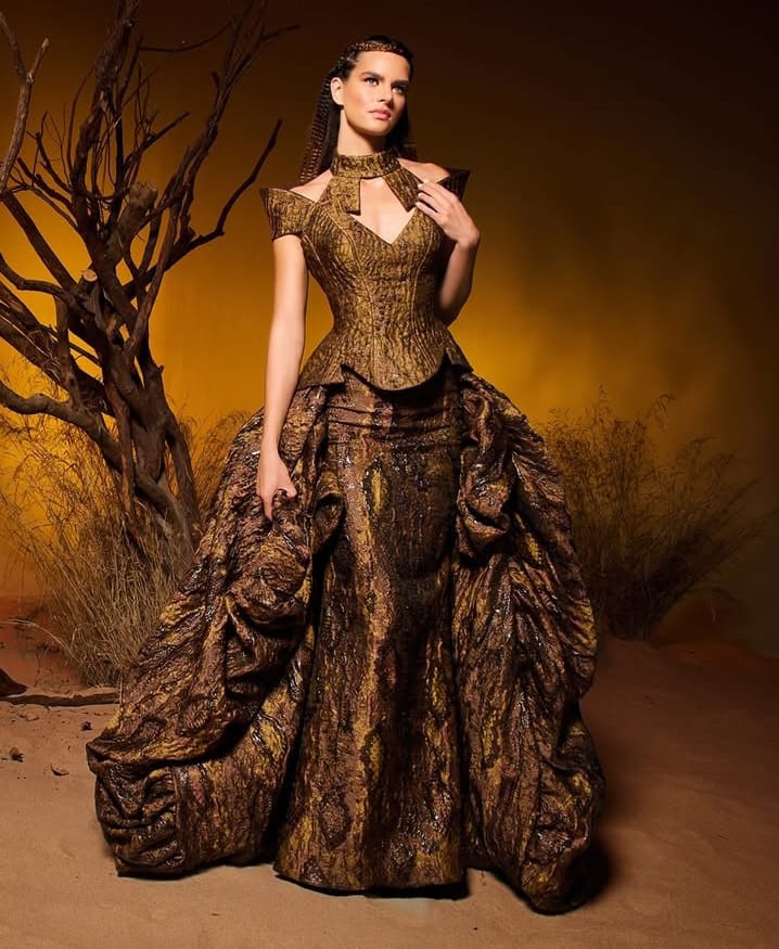 في أقمشة الهوت كوتور، اعتمد المصمم طبعات رقمية مستوحاة من كائنات البيئة الصحراوية، كترجمة بصرية للحرية، تتجلّى في الجلود والأقمشة الانسيابية، حيث ينشأ حوار متوازن بين الشراسة والرقة. أما خامات مثل الكريب، الساتان والجلد، فتُستخدم بحسّ دقيق يعكس التناقض بين السكون والحركة، لتجسّد كل قطعة شراسة الأنوثة، لكن بلغة منسجمة مع النعومة والأناقة.