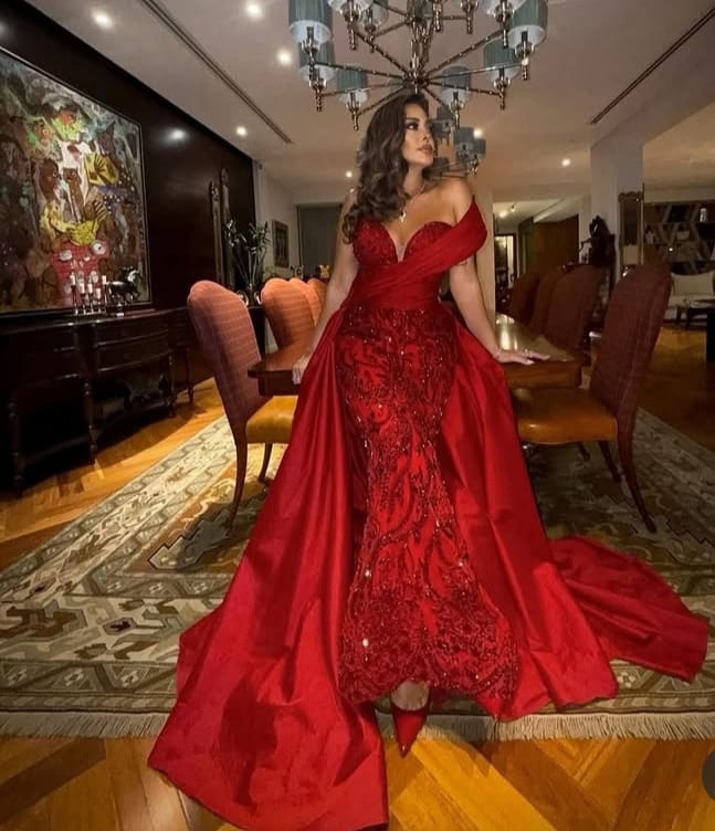 أما داليا البحيري، فاختارت الأحمر بصيغة فخمة أقرب إلى الملوكية الأسطورية. ثوبها الطويل جاء موشّى بالكامل، مع صدر محفور وطيات أمامية بدت كأوشحة من مجدٍ متراكم.