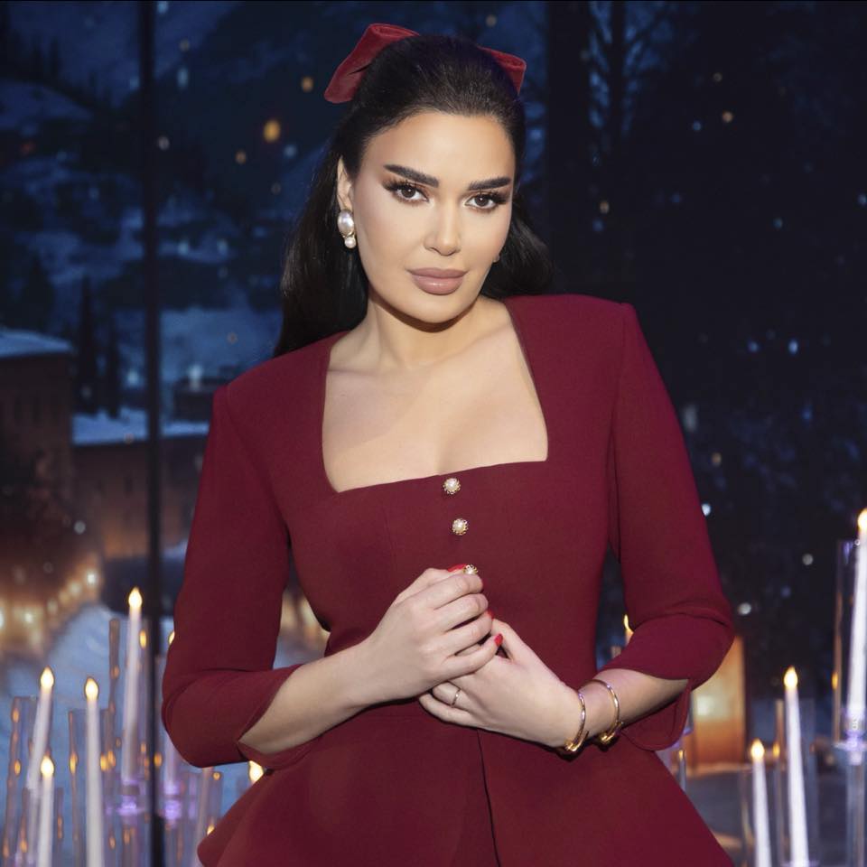 كعادتها، اختارت هيفاء وهبي الأحمر بأسلوب جريء ولافت، إذ نشرت فيديو قرب شجرة الميلاد وهي ترتدي ثوبًا أحمر قصيرًا بذيل طويل، من توقيع رامي سلمون. زُيّن الثوب بوردة فضية بارزة أضفت عليه طابعًا فنيًا خاصًا، نسّقته مع عقد ماسي انسجم مع تفاصيل الوردة.