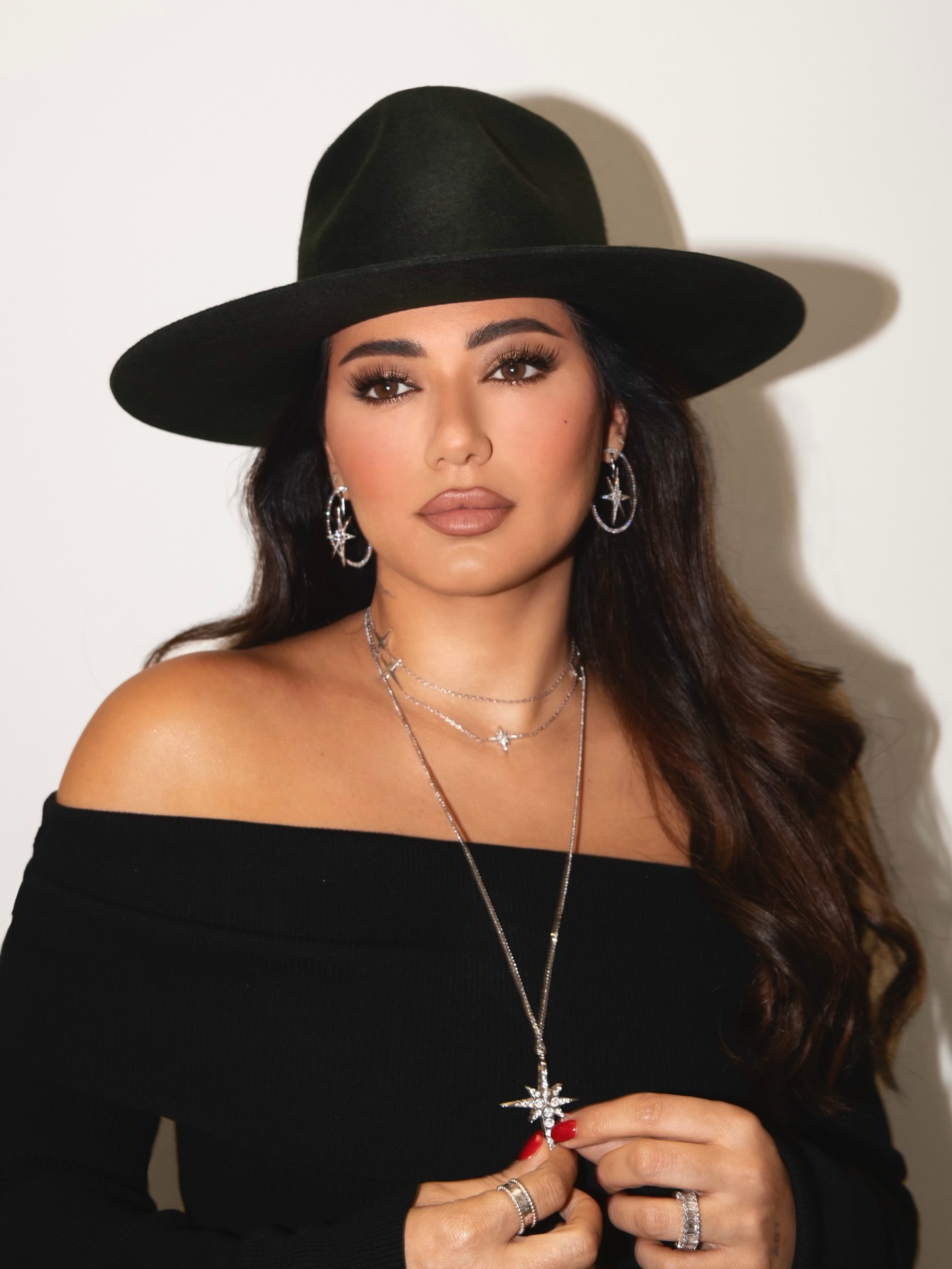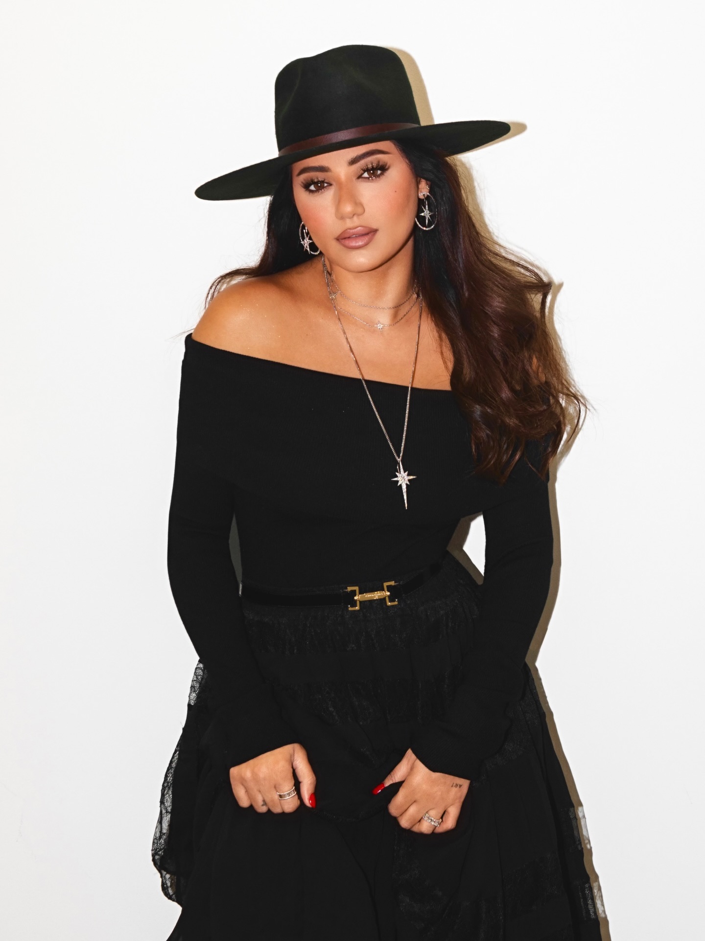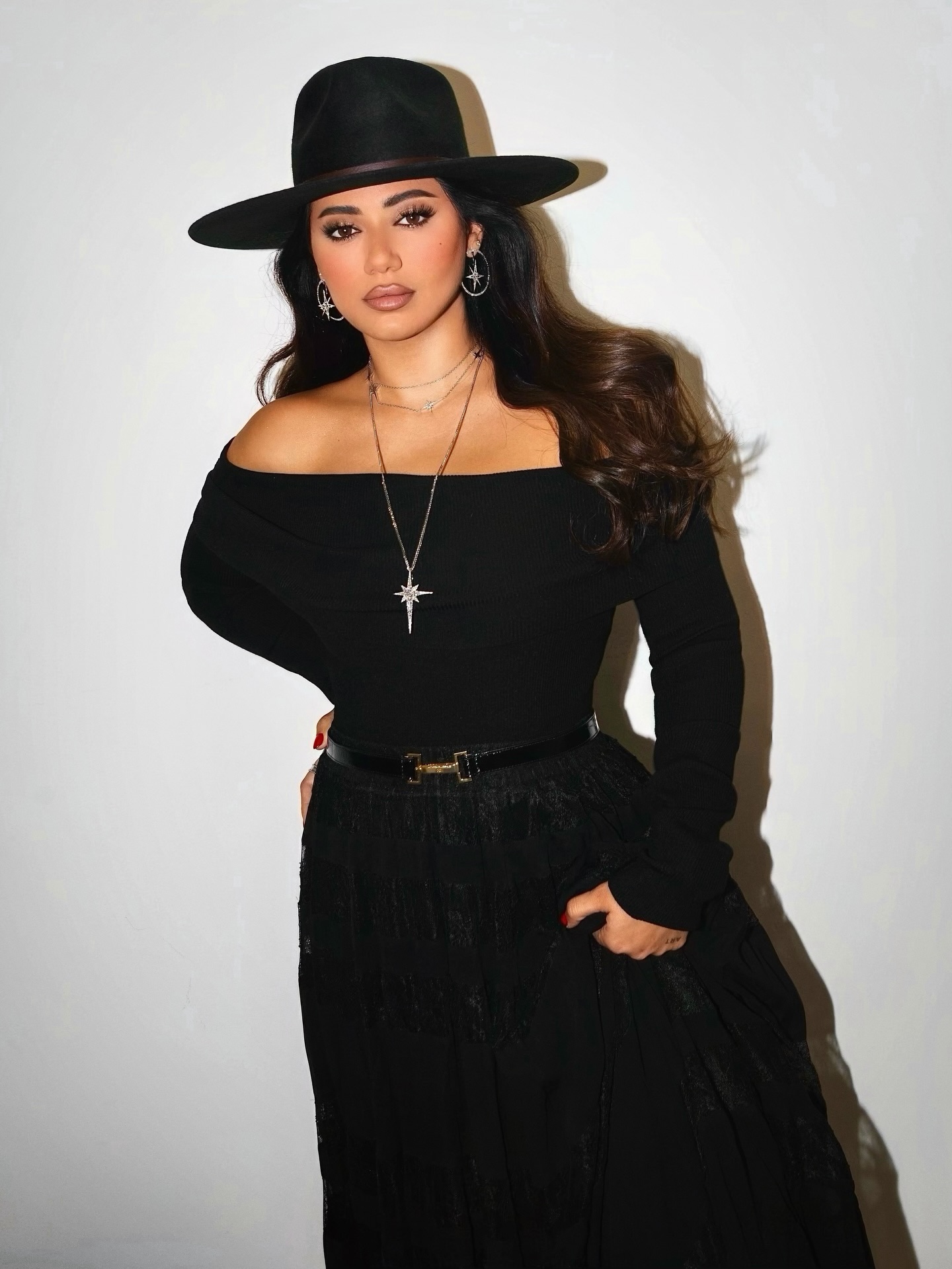 الإكسسوارات كانت تكملة متقنة للوك: قبعة سوداء كبيرة أضفت طلة ملكية على الإطلالة، بينما جاء الشعر المنسدل بتموجات ناعمة ليبرز الوجه، والمكياج باللون الترابي المنحوت على جمال ملامحها، ليكمل الطابع الفخم والراقي.