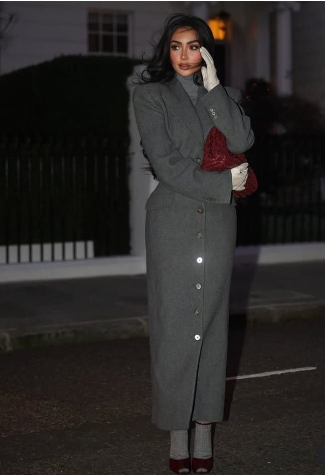 الإطلالة تعكس براعة نور في الجمع بين الكلاسيكية والجرأة، بين محتشم الشتاء ولمسات اللون البرغندي التي كسرت القاعدة بطريقة جذابة وملفتة.