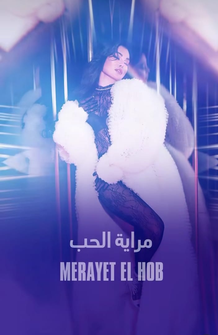 في «مراية حب»، الأغنية الرومانسية، نراها بثوب من الشبك ينسدل على الجسد، مع فرو أبيض يلامس الكتفين. إطلالة حالمة، ناعمة، تشبه الحب حين يكون انعكاسًا صافياً للذات، وحين تكون الأنوثة حاضرة كطقس يغلف العين والمكان.