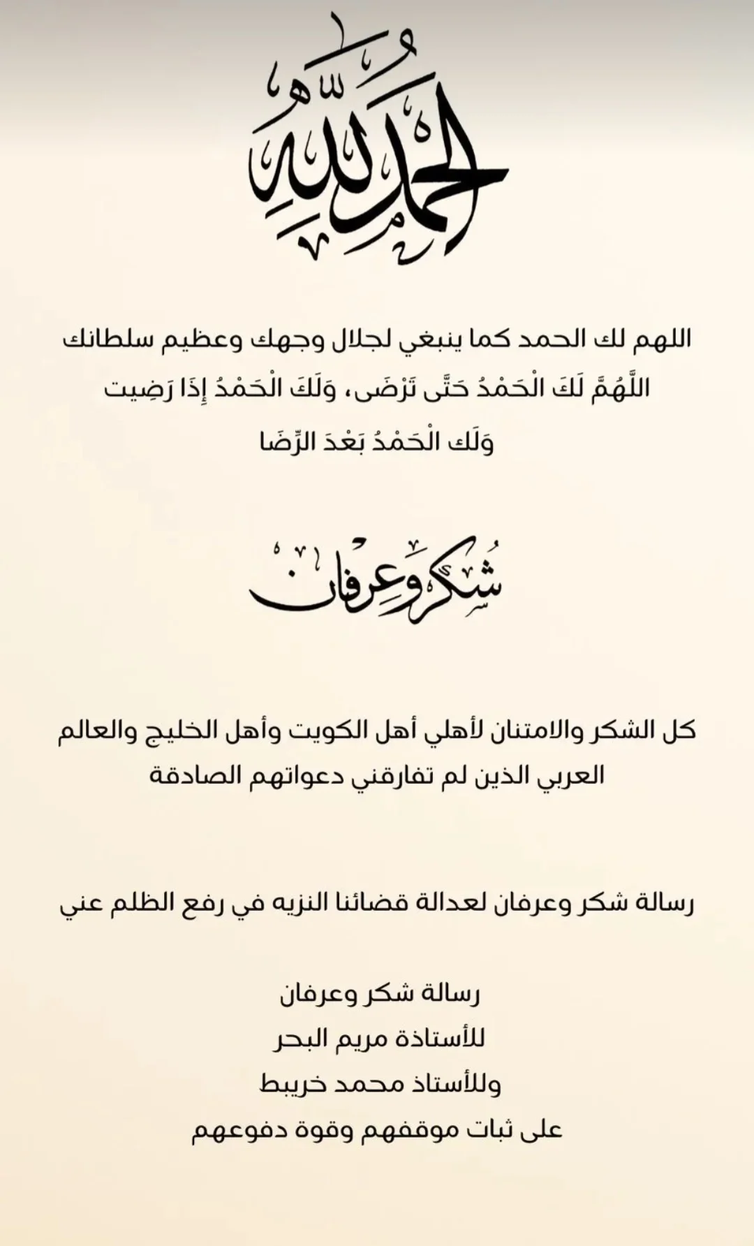 وأضافت: “كل الشكر والامتنان لأهلي أهل الكويت وأهل الخليج والعالم العربي الذين لم تفارقني دعواتهم الصادقة، وأوجّه رسالة شكر وعرفان لعدالة قضائنا النزيه في رفع الظلم عني”.