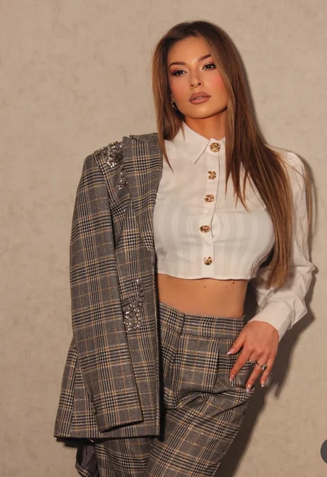 نسّقت البذلة مع قميص كروب أبيض ذي أزرار ذهبية كبيرة، ما أضفى على الإطلالة روحاً عصرية أنثوية. واكتملت الصورة بتسريحة شعر ناعمة ملساء، مع مكياج وردي متناغم وشفاه زهرية مطفأة، ليكون اللوك مثالياً للكاميرا والأضواء.
