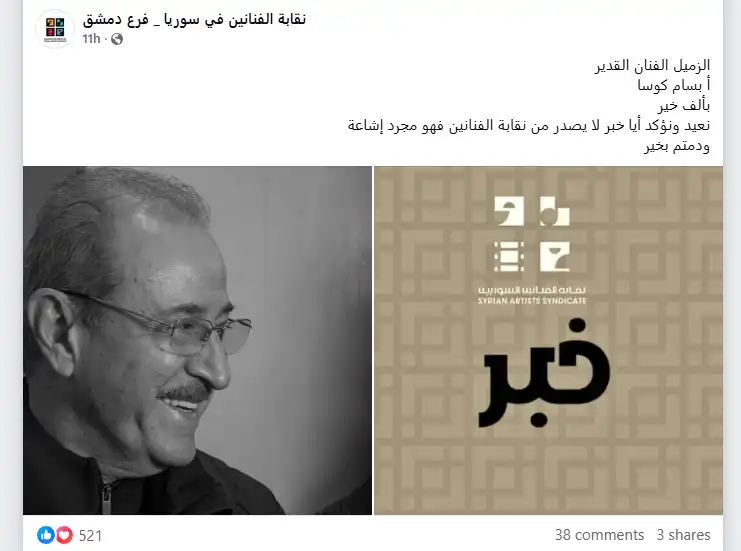 في أعقاب تداول الشائعة، أصدرت نقابة الفنانين السوريين بيانًا أكدت فيه سلامة الفنان بسام كوسا، مشددة على أن الأنباء المتداولة حول وفاته غير صحيحة ولا تستند إلى أي مصدر موثوق.